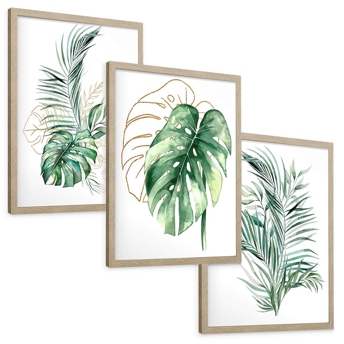 Zestaw obrazy w ramie, plakaty - liście, monstera, rośliny - rama drewno