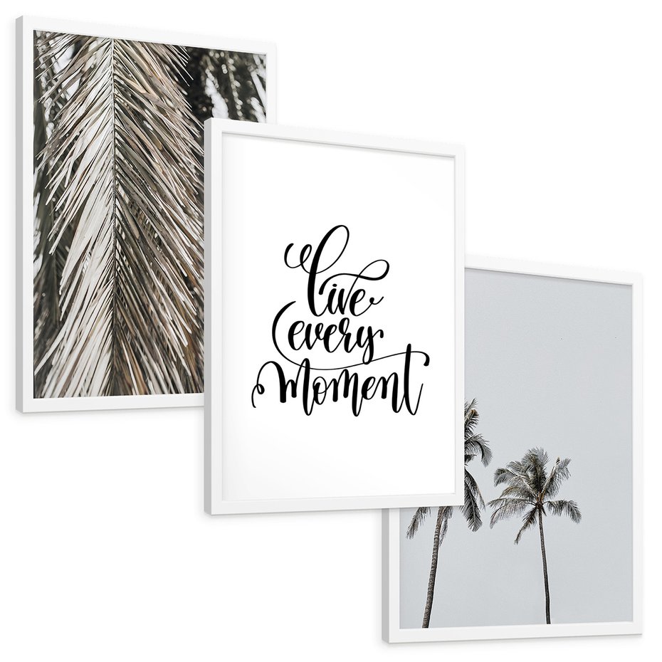 Zestaw obrazy w ramie, plakaty - liście, palmy, napisy - rama biała