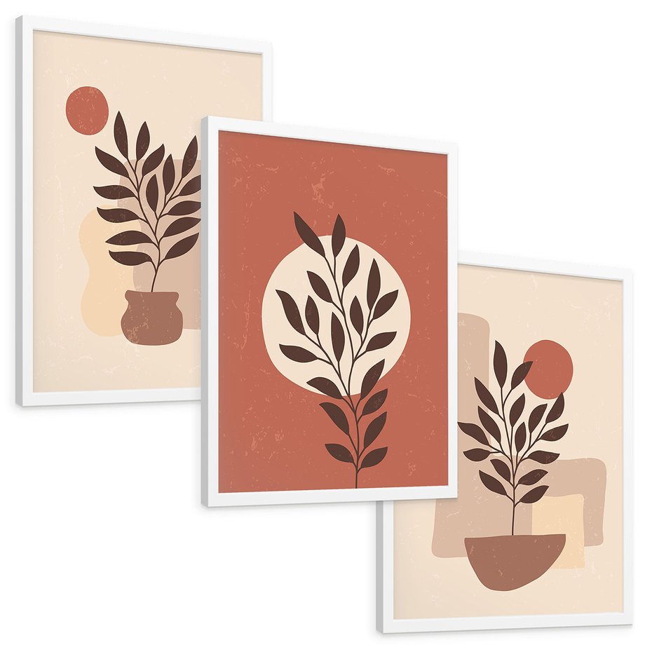Zestaw obrazy w ramie, plakaty - liście, roślina, abstrakcja - rama biała