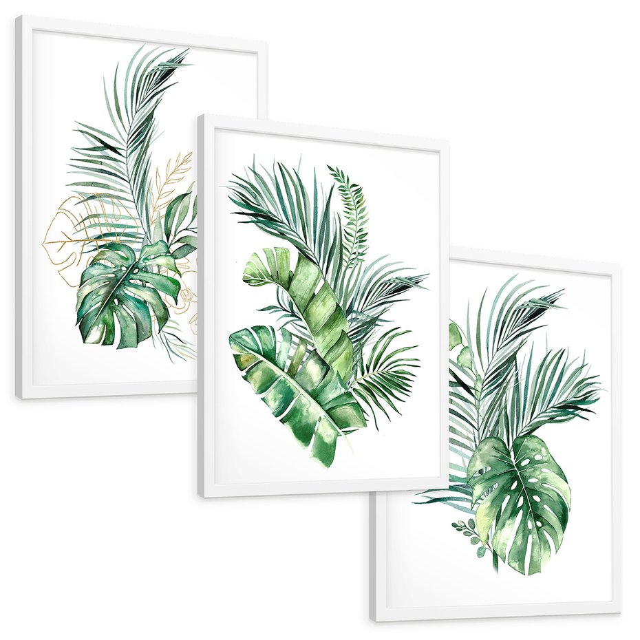 Zestaw obrazy w ramie, plakaty - liście, rośliny, tropikalne - rama biała