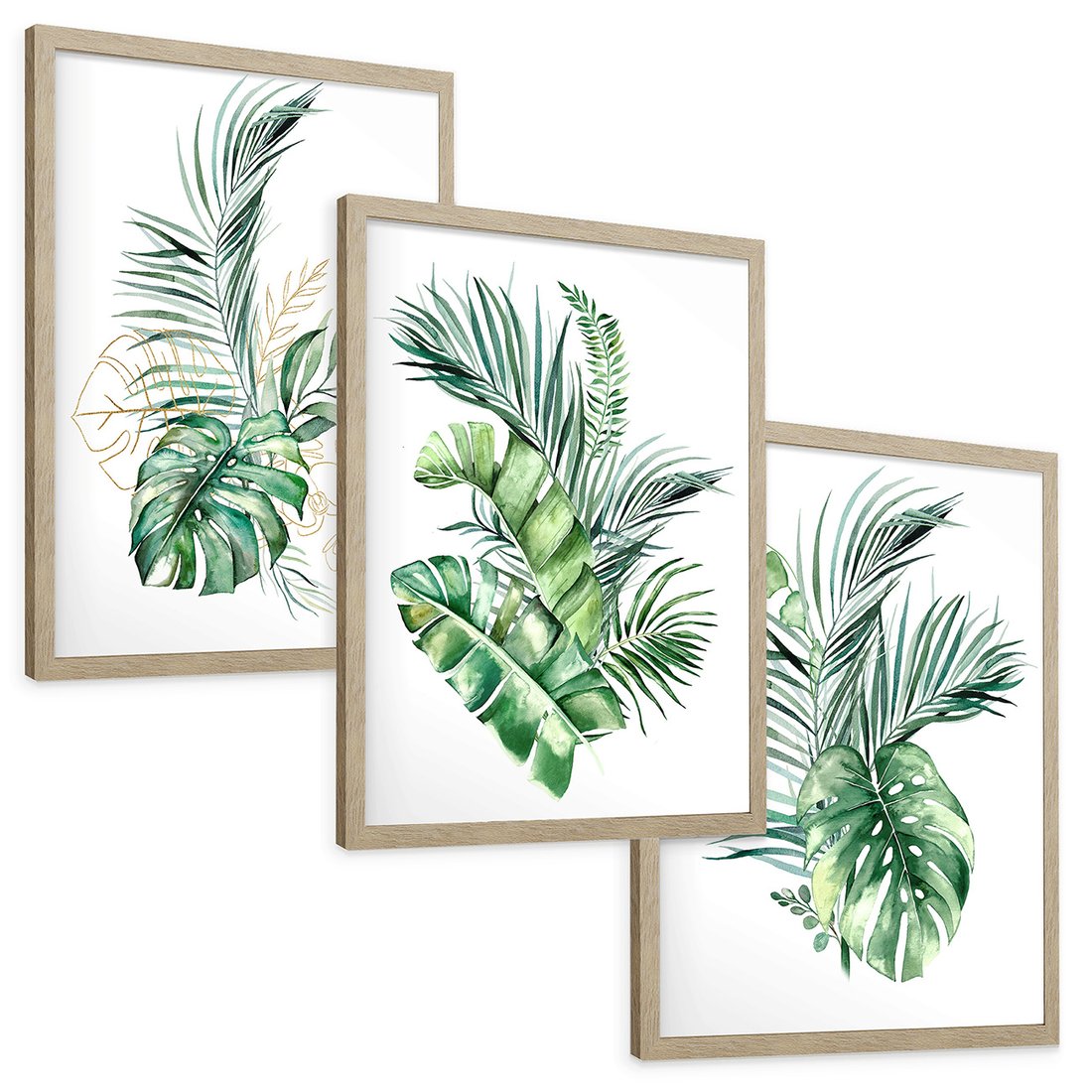 Zestaw obrazy w ramie, plakaty - liście, rośliny, tropikalne - rama drewno