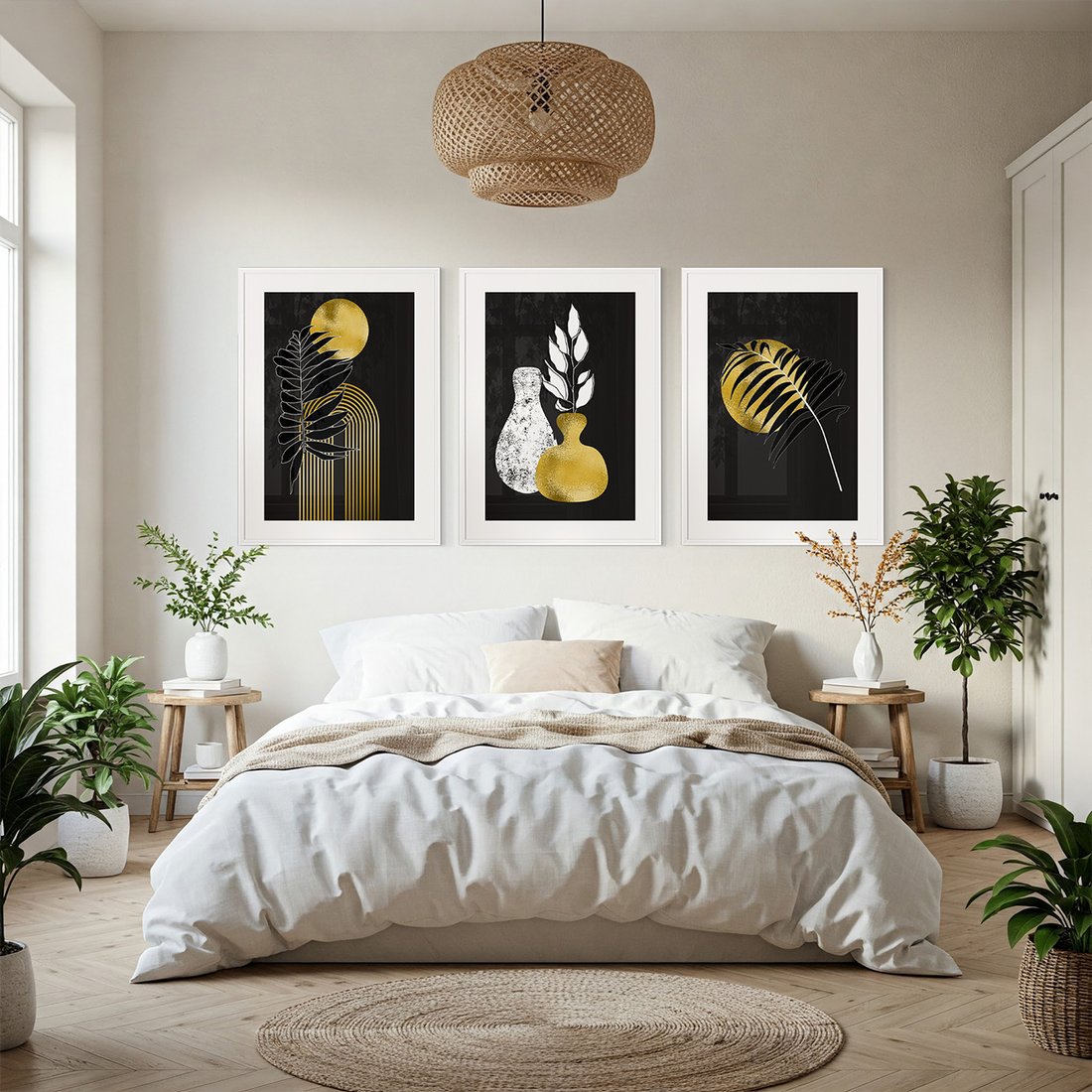 - Zestaw obrazy w ramie, plakaty - liście, złoto, abstrakcja