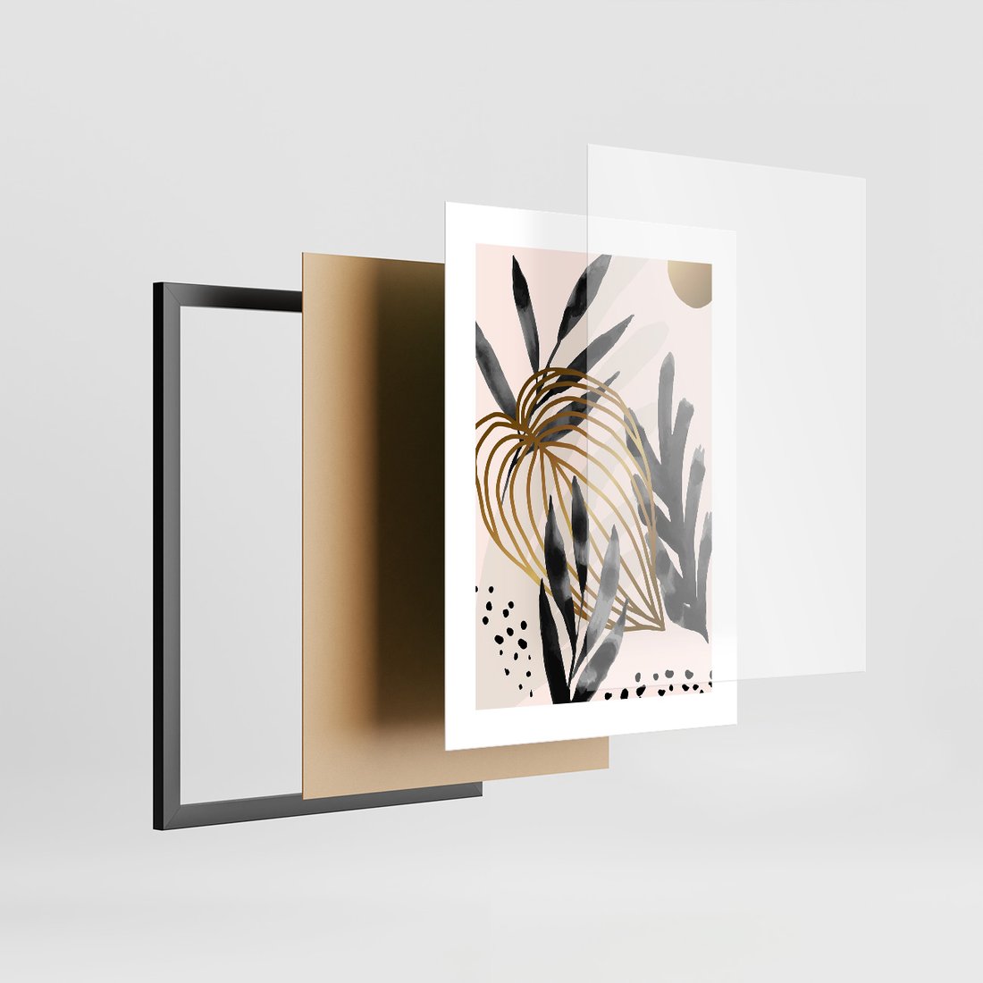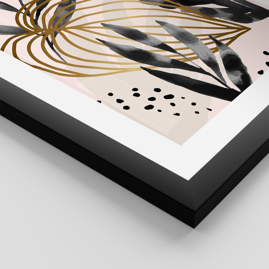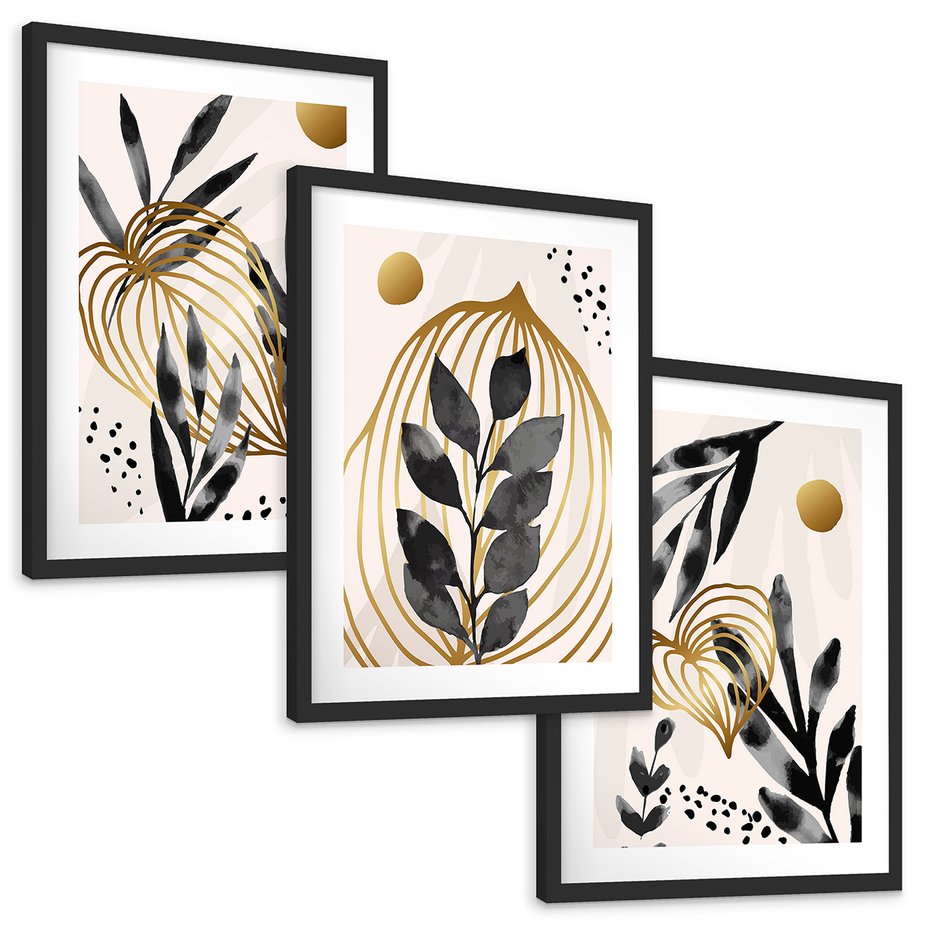Zestaw obrazy w ramie, plakaty - liście, złoto, abstrakcja - rama czarna