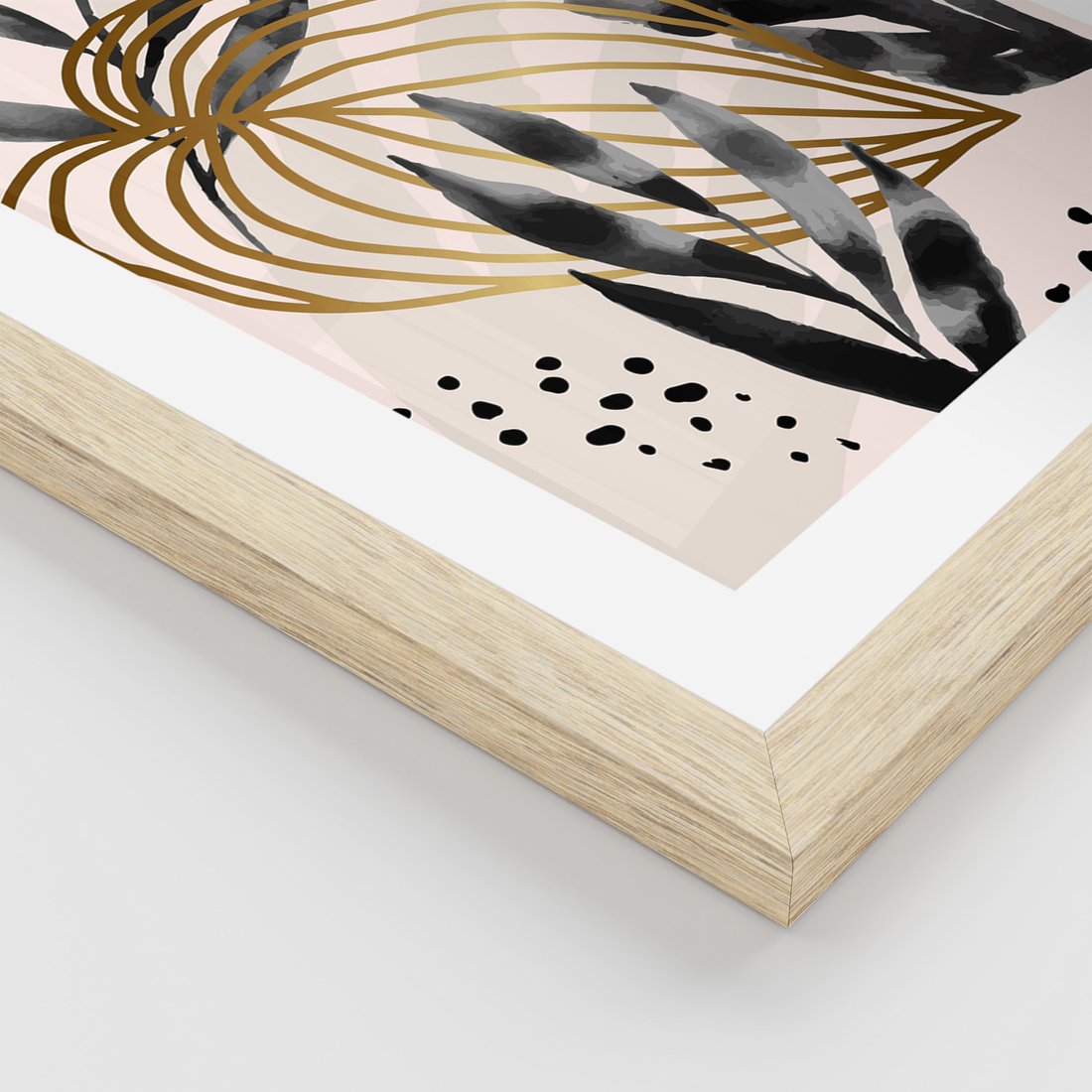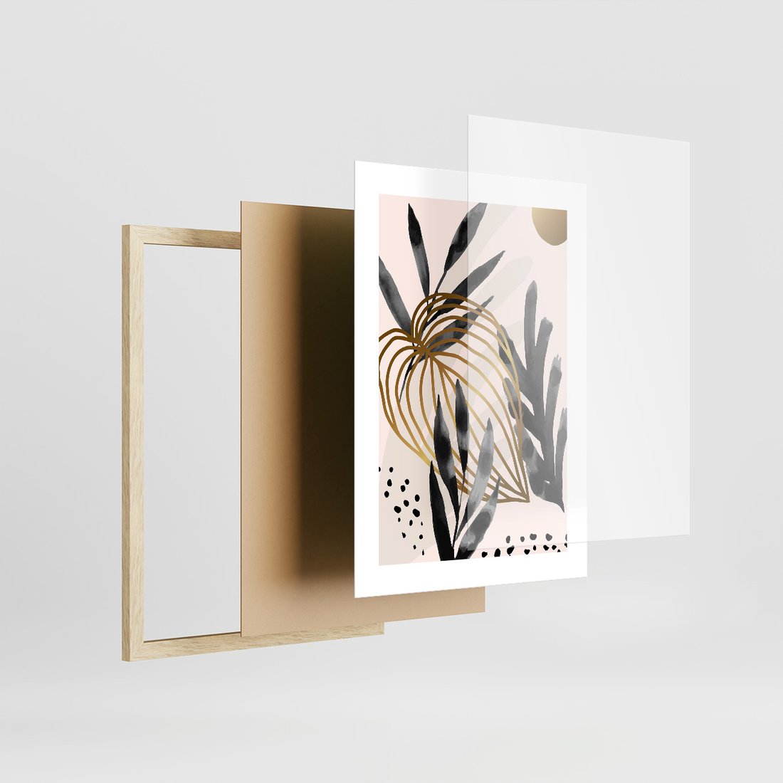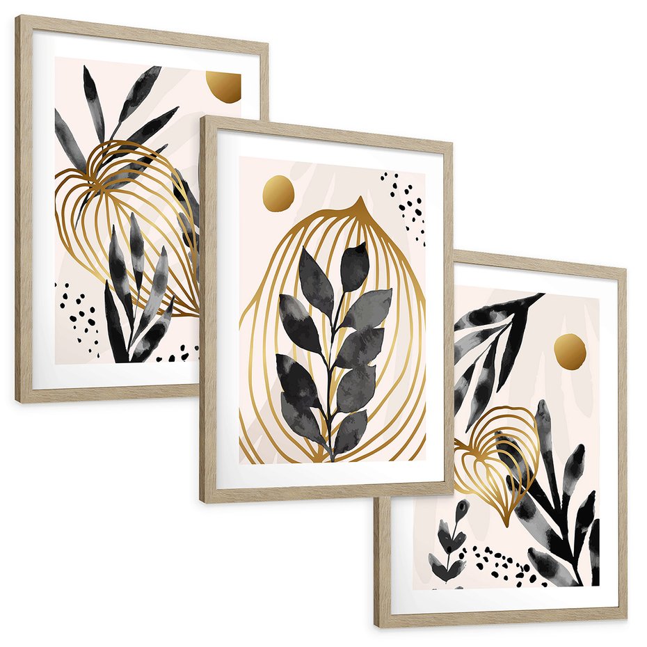 Zestaw obrazy w ramie, plakaty - liście, złoto, abstrakcja - rama drewno