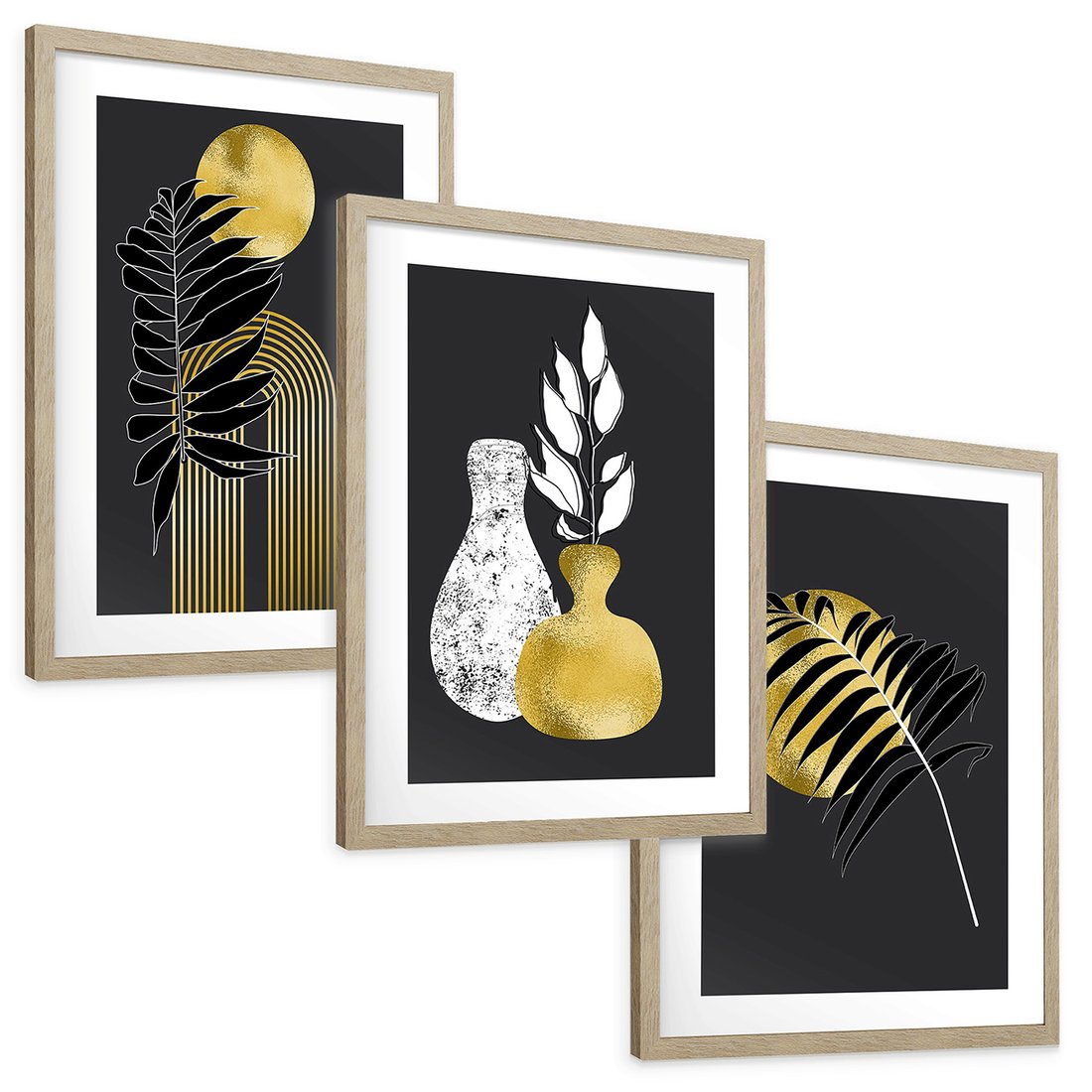 Zestaw obrazy w ramie, plakaty - liście, złoto, abstrakcja - rama drewno