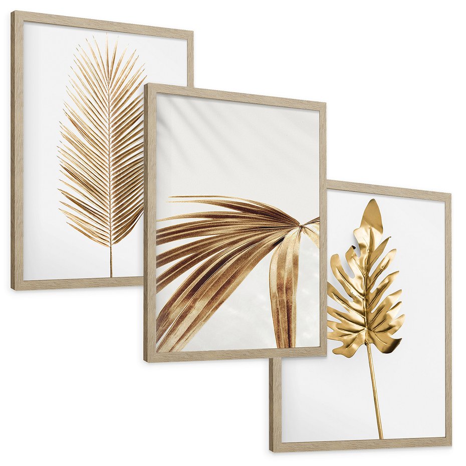 Zestaw obrazy w ramie, plakaty - liście, złoty, dekoracja - rama drewno