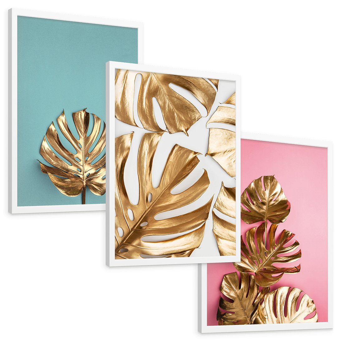 Zestaw obrazy w ramie, plakaty - liście, złoty, monstera - rama biała