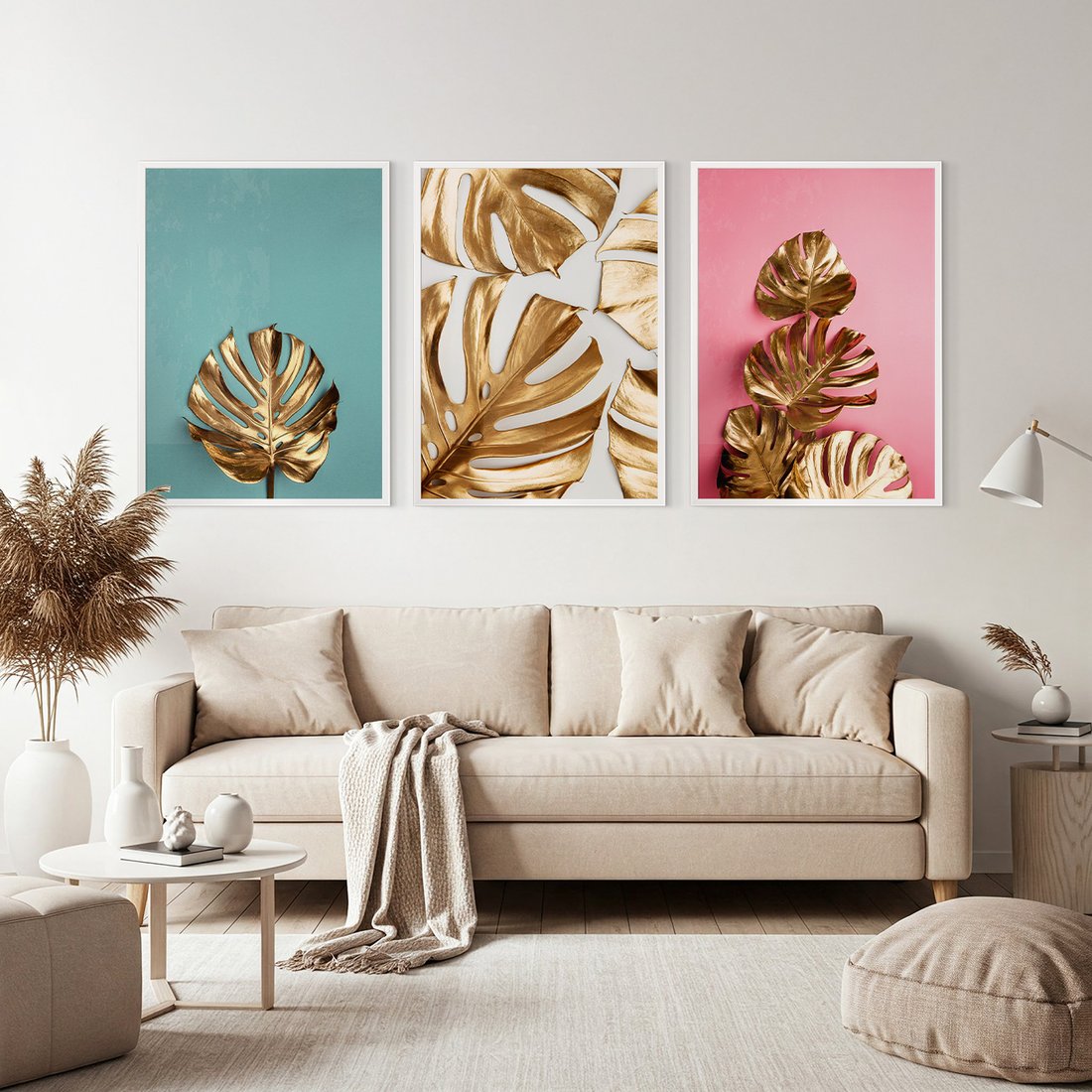 - Zestaw obrazy w ramie, plakaty - liście, złoty, monstera