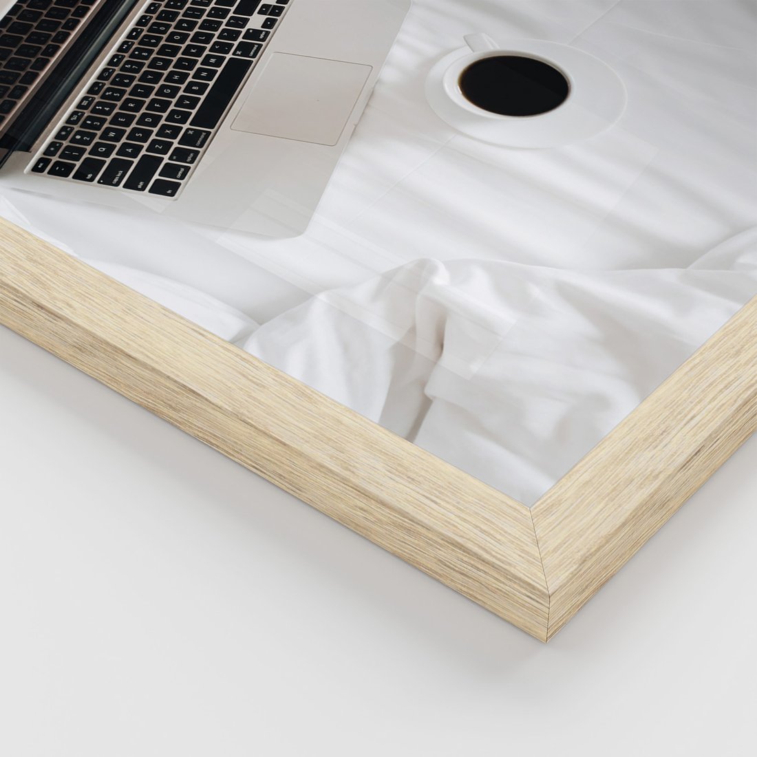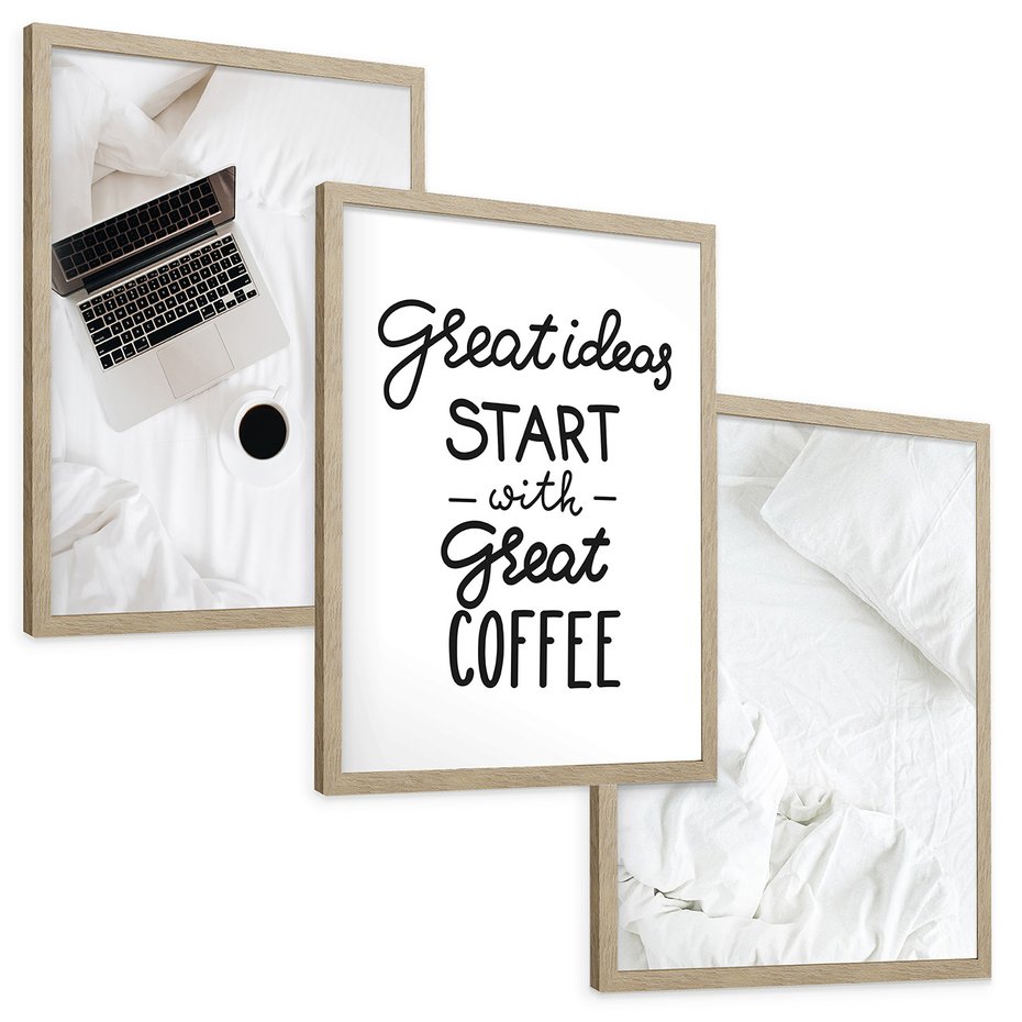Zestaw obrazy w ramie, plakaty - minimalizm, kawa, laptop - rama drewno