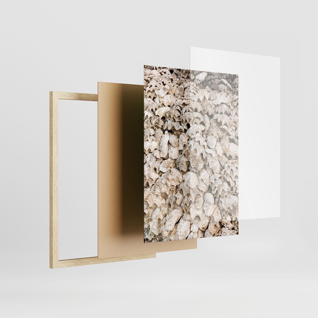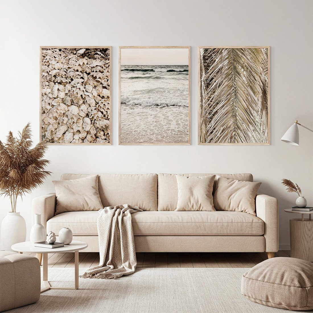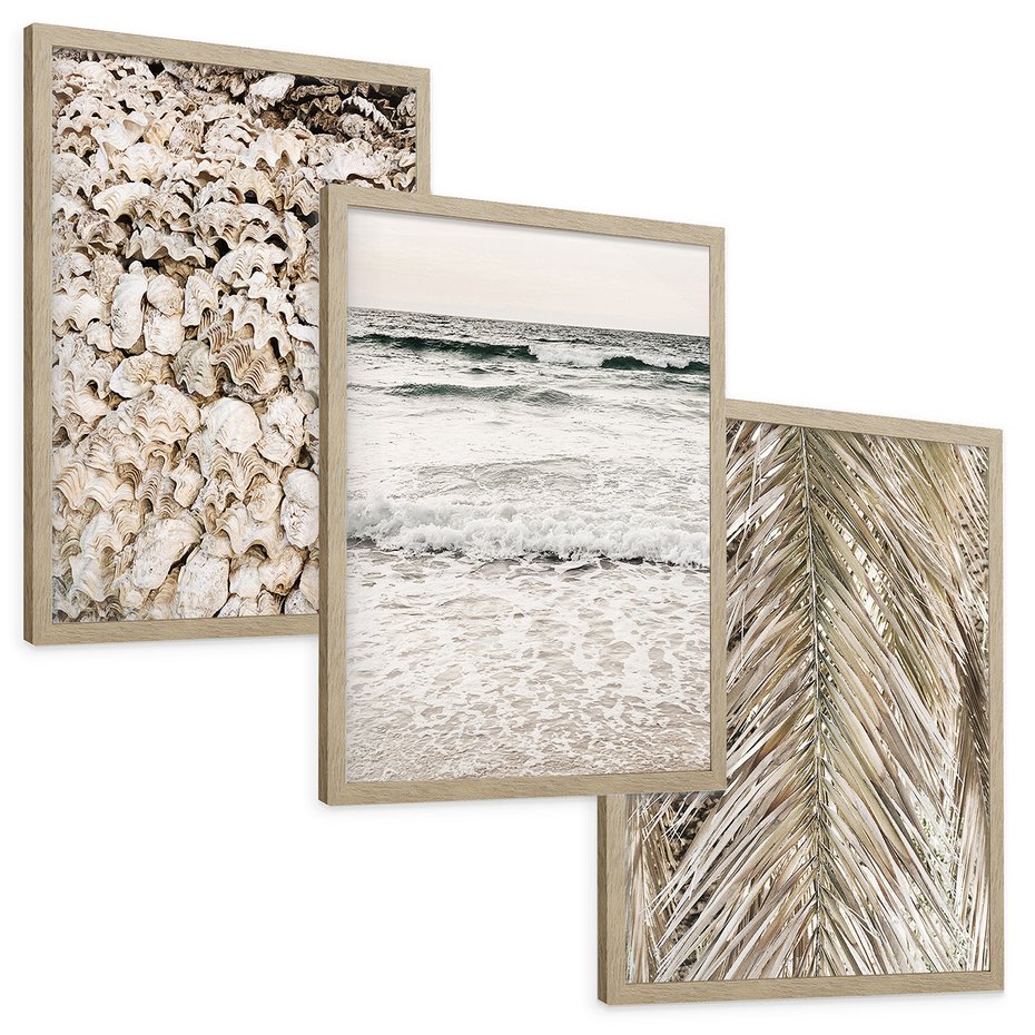 Zestaw obrazy w ramie, plakaty - muszle, morze, liście - rama drewno