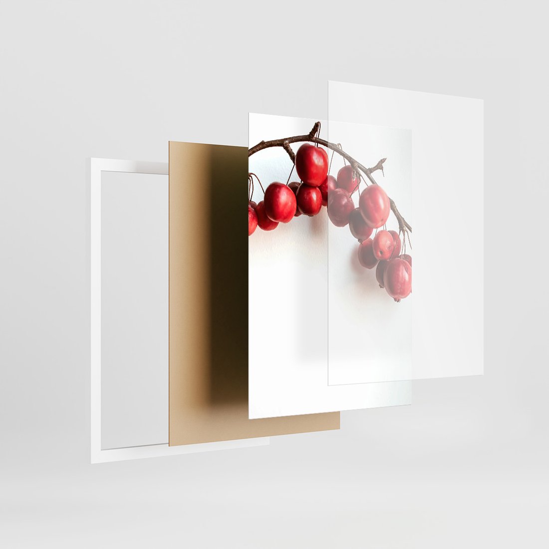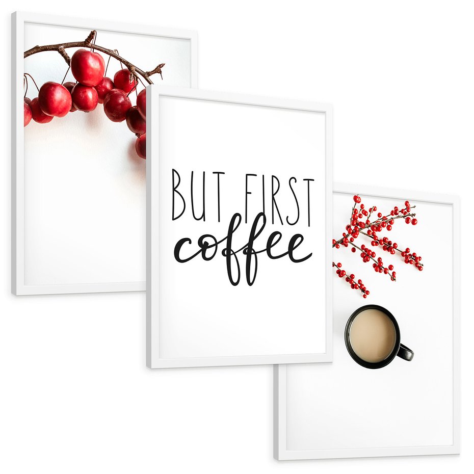 Zestaw obrazy w ramie, plakaty - owoce, kawa, gałązka - rama biała