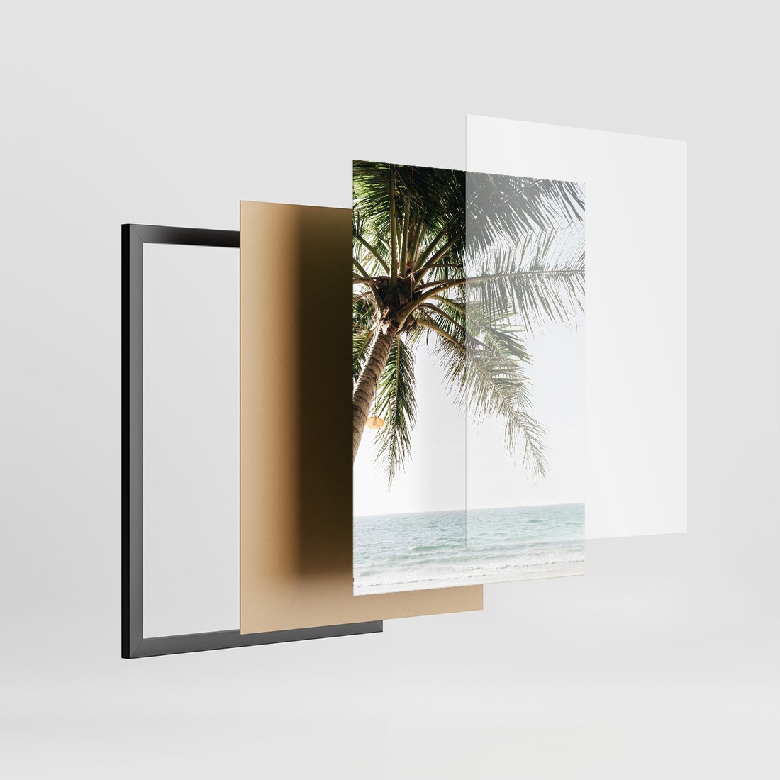 Zestaw obrazy w ramie, plakaty - palma, morze, cień - rama czarna