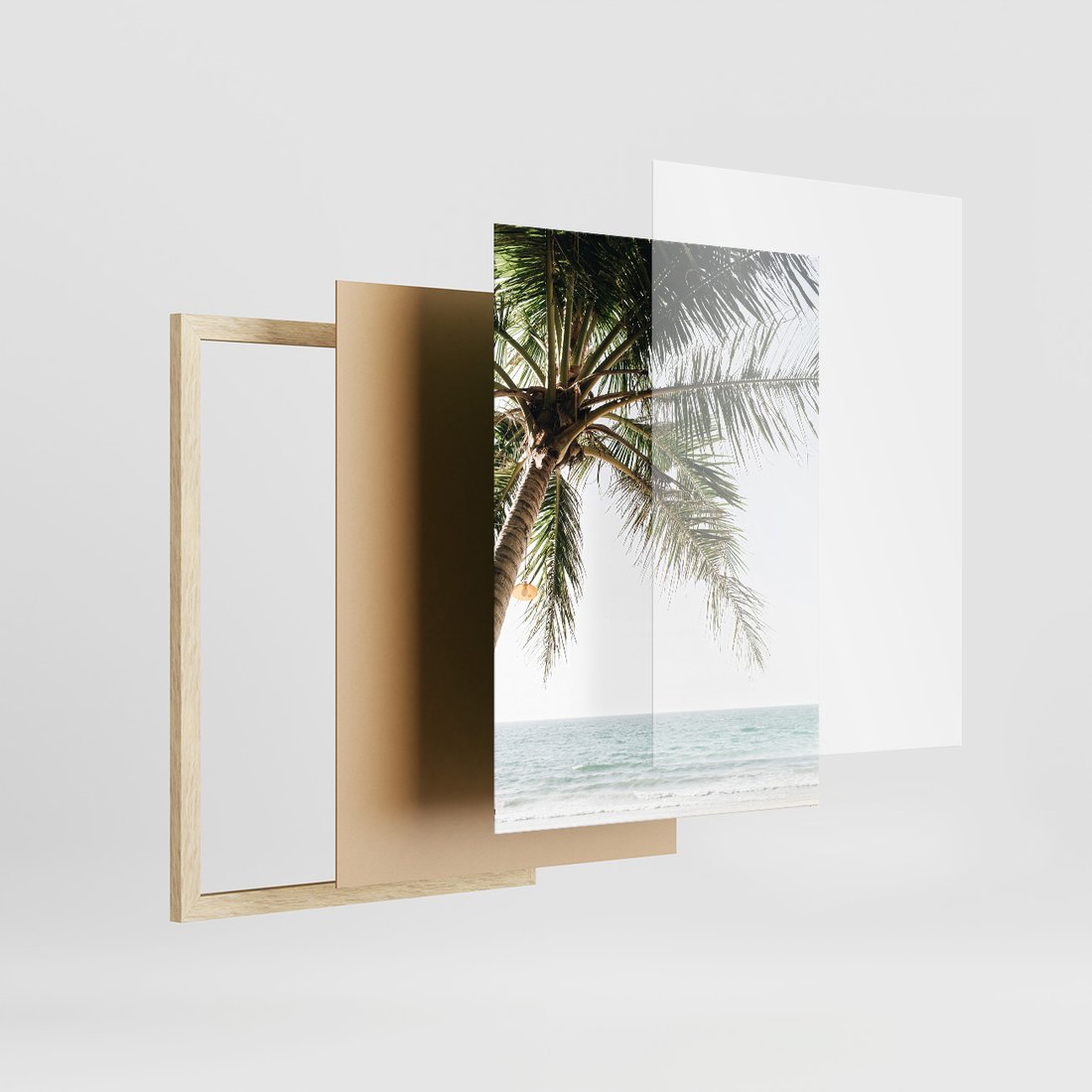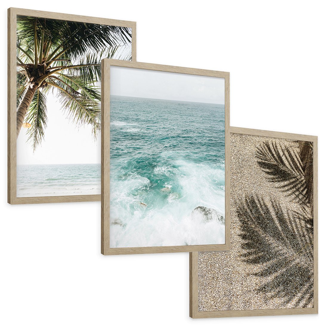 Zestaw obrazy w ramie, plakaty - palma, morze, cień - rama drewno