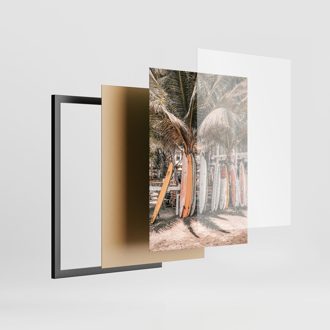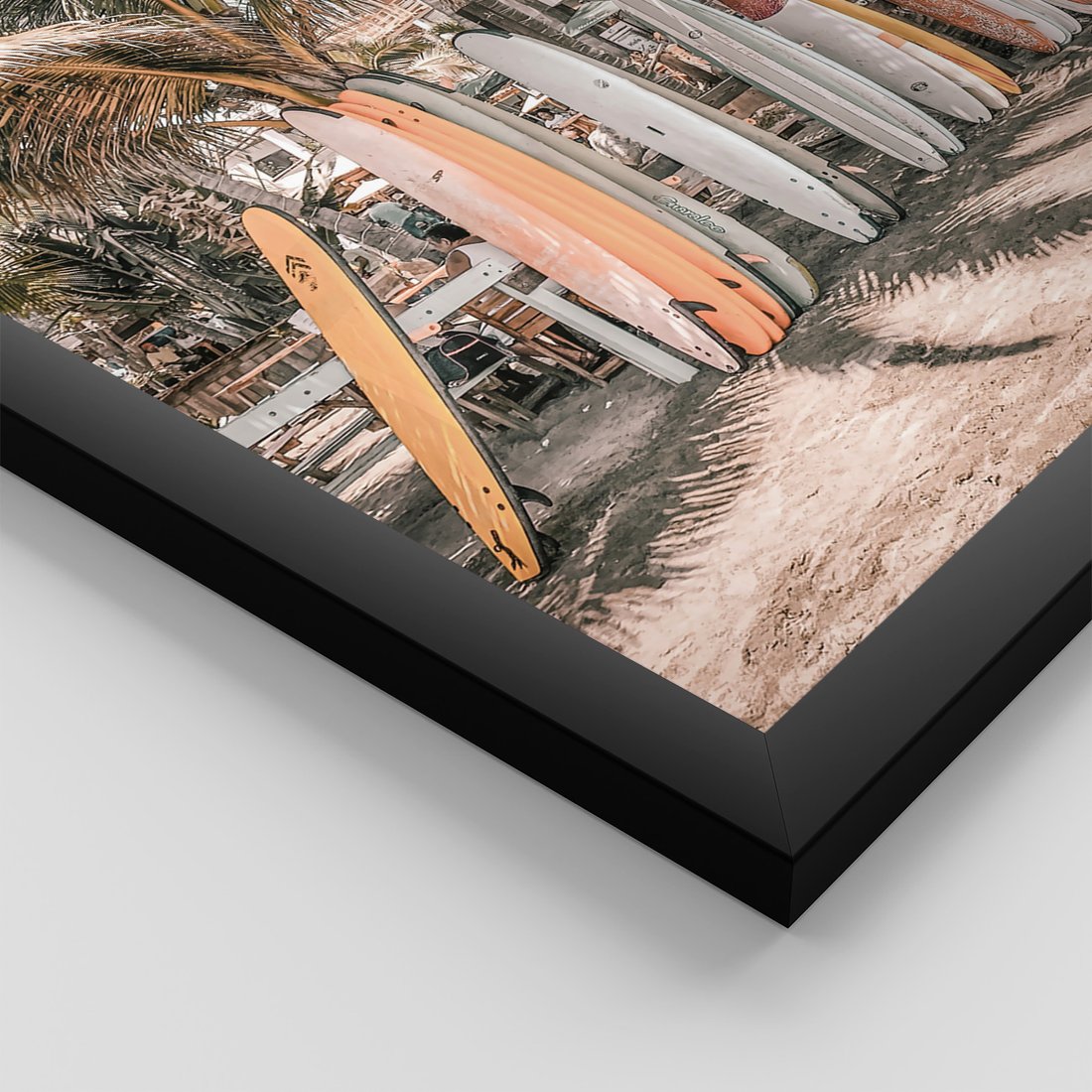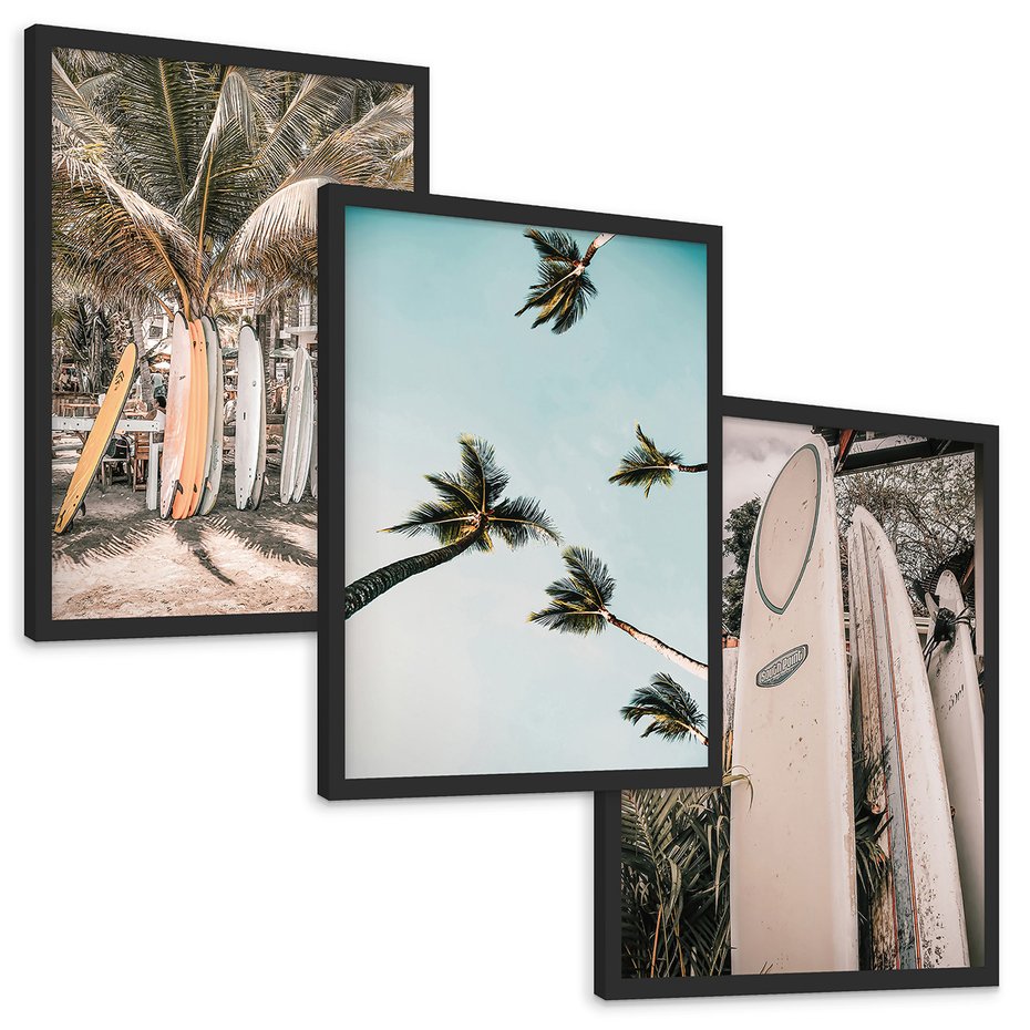 Zestaw obrazy w ramie, plakaty - palmy, deski surfingowe, plaża - rama czarna