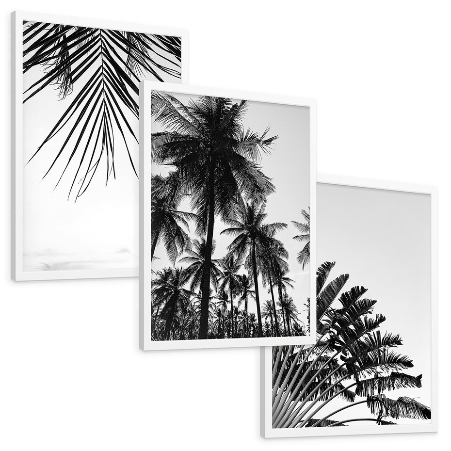 Zestaw obrazy w ramie, plakaty - palmy, liście, tropikalne - rama biała