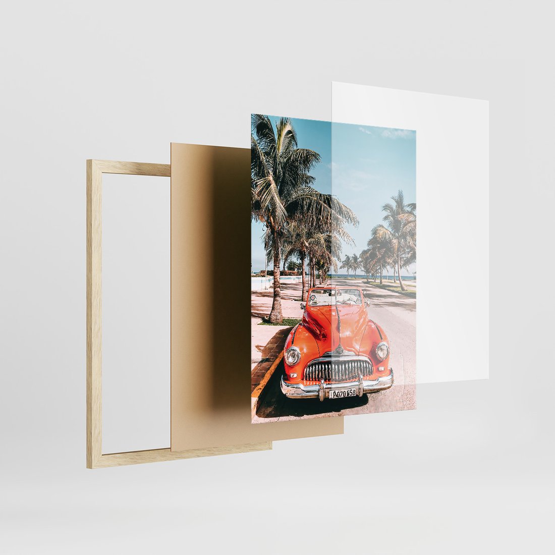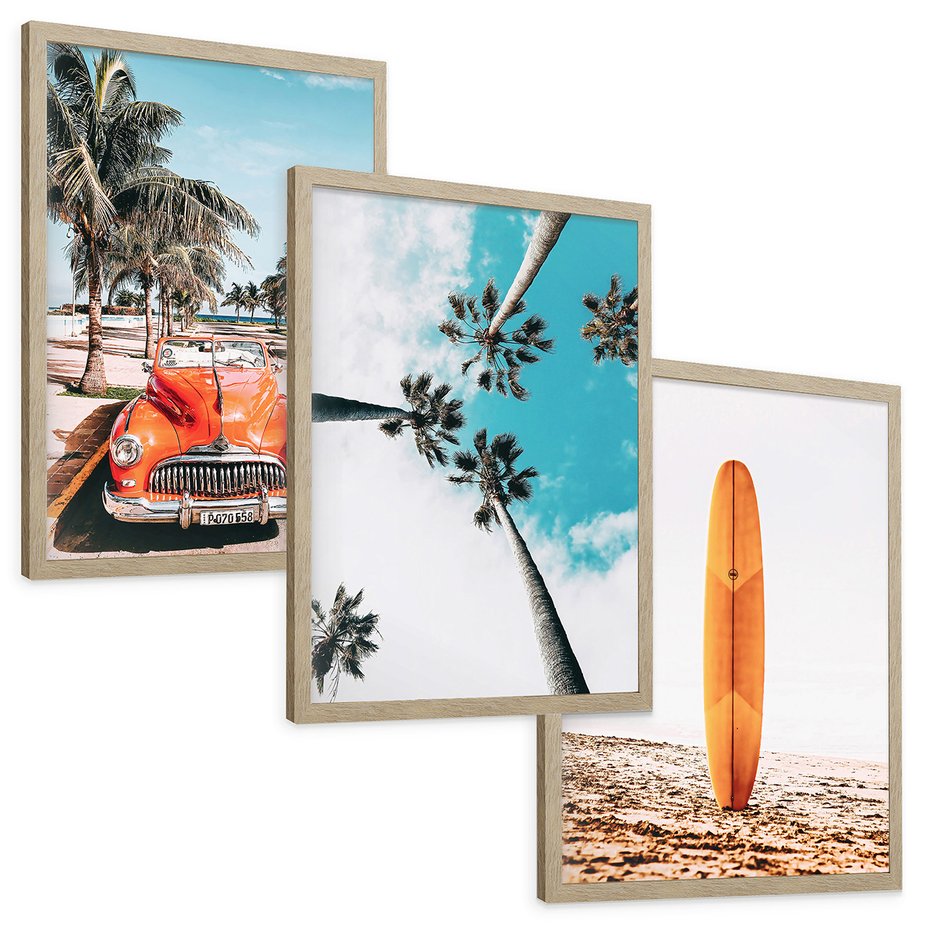 Zestaw obrazy w ramie, plakaty - palmy, plaża, wakacje - rama drewno