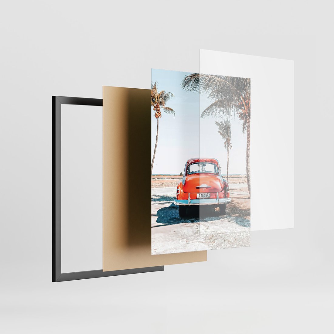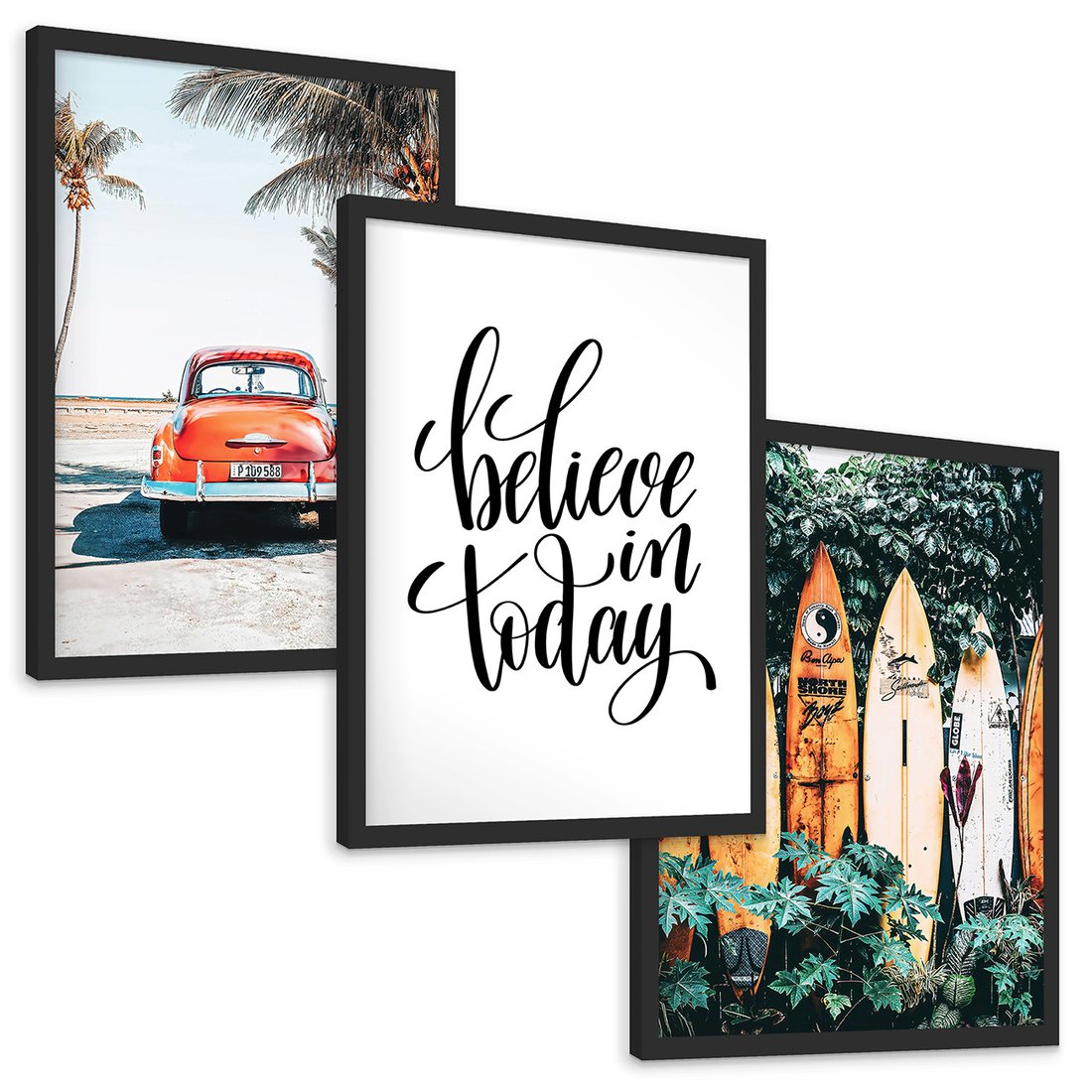 Zestaw obrazy w ramie, plakaty - palmy, samochód, deski surfingowe - rama czarna