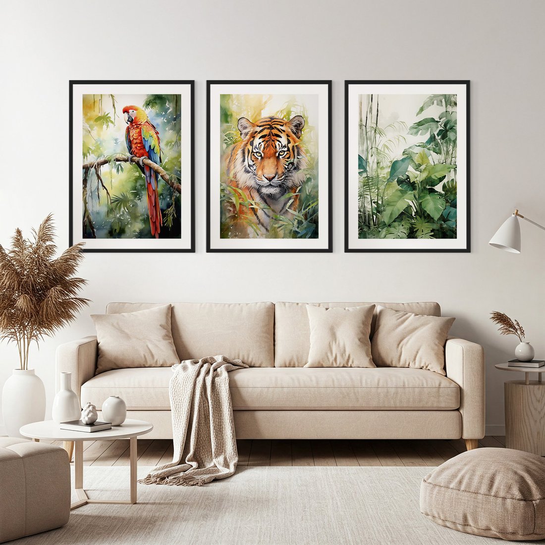 • Zestaw obrazy w ramie, plakaty - papuga, liście, tygrys
