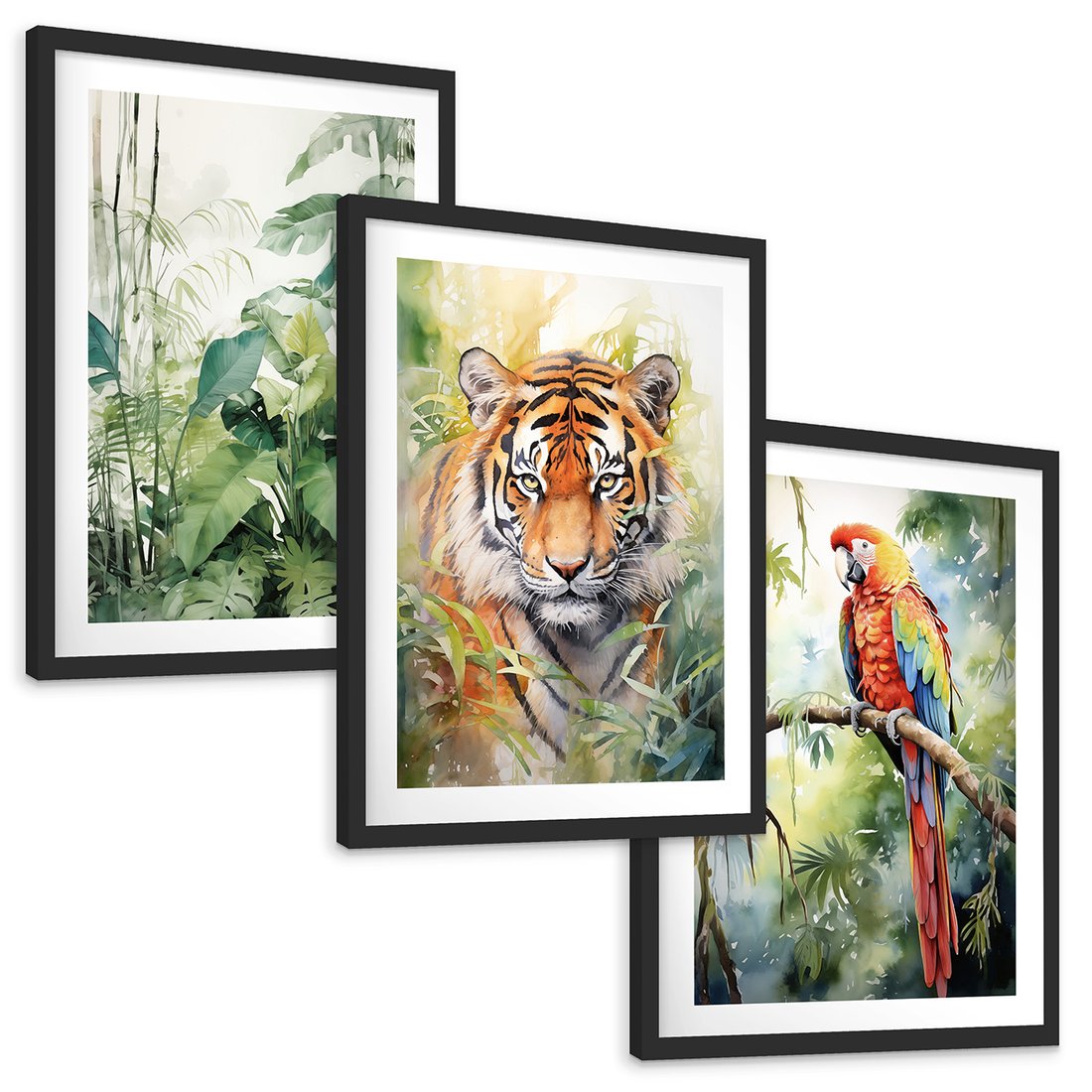 Zestaw obrazy w ramie, plakaty - papuga, liście, tygrys - rama czarna