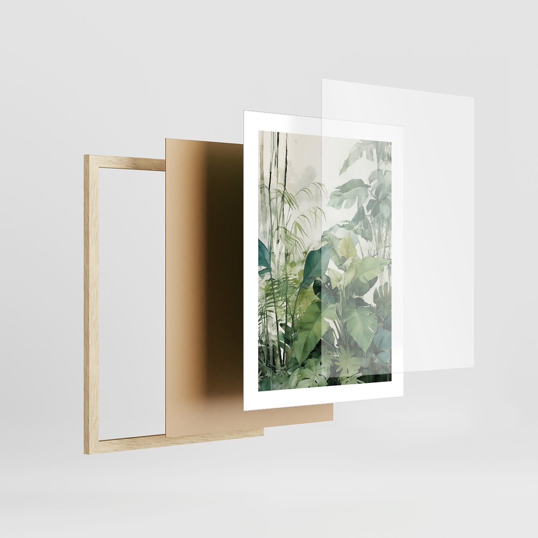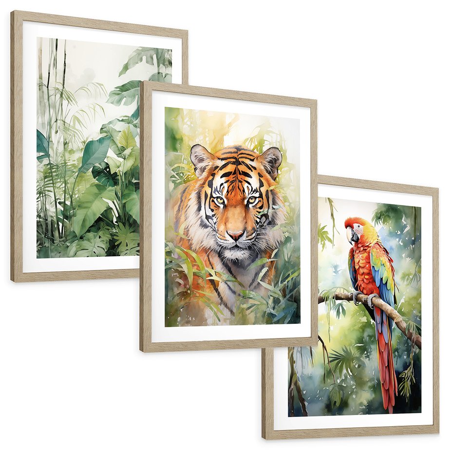 Zestaw obrazy w ramie, plakaty - papuga, liście, tygrys - rama drewno