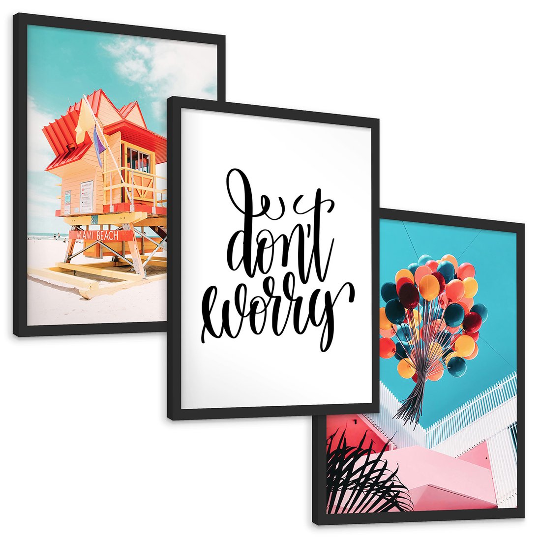 Zestaw obrazy w ramie, plakaty - plaża, budynek, balony - rama czarna