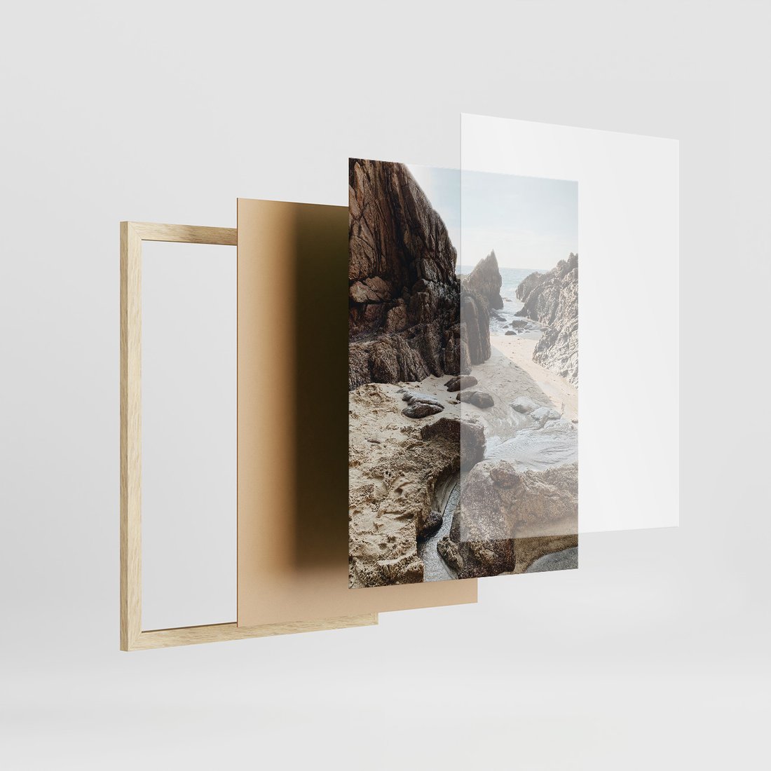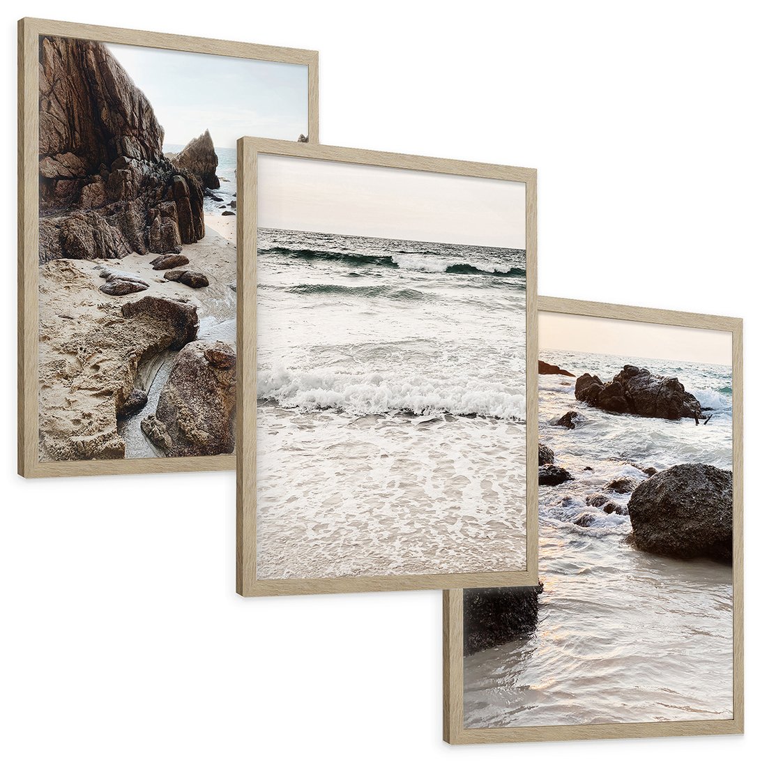Zestaw obrazy w ramie, plakaty - plaża, morze, skały - rama drewno