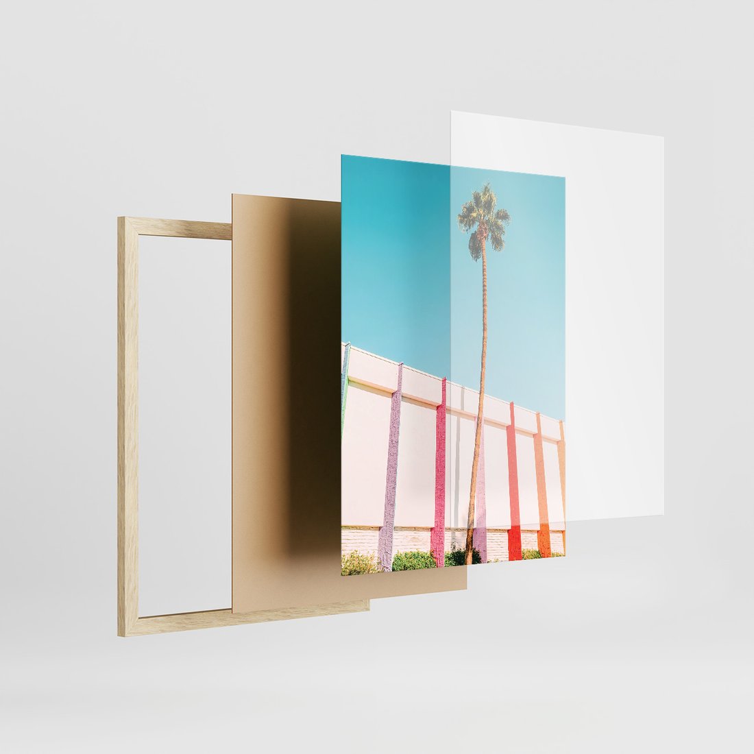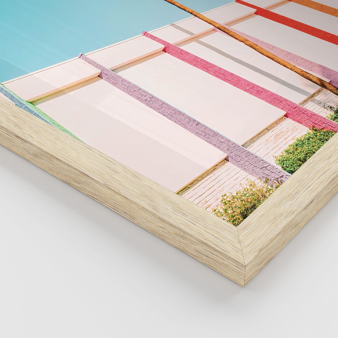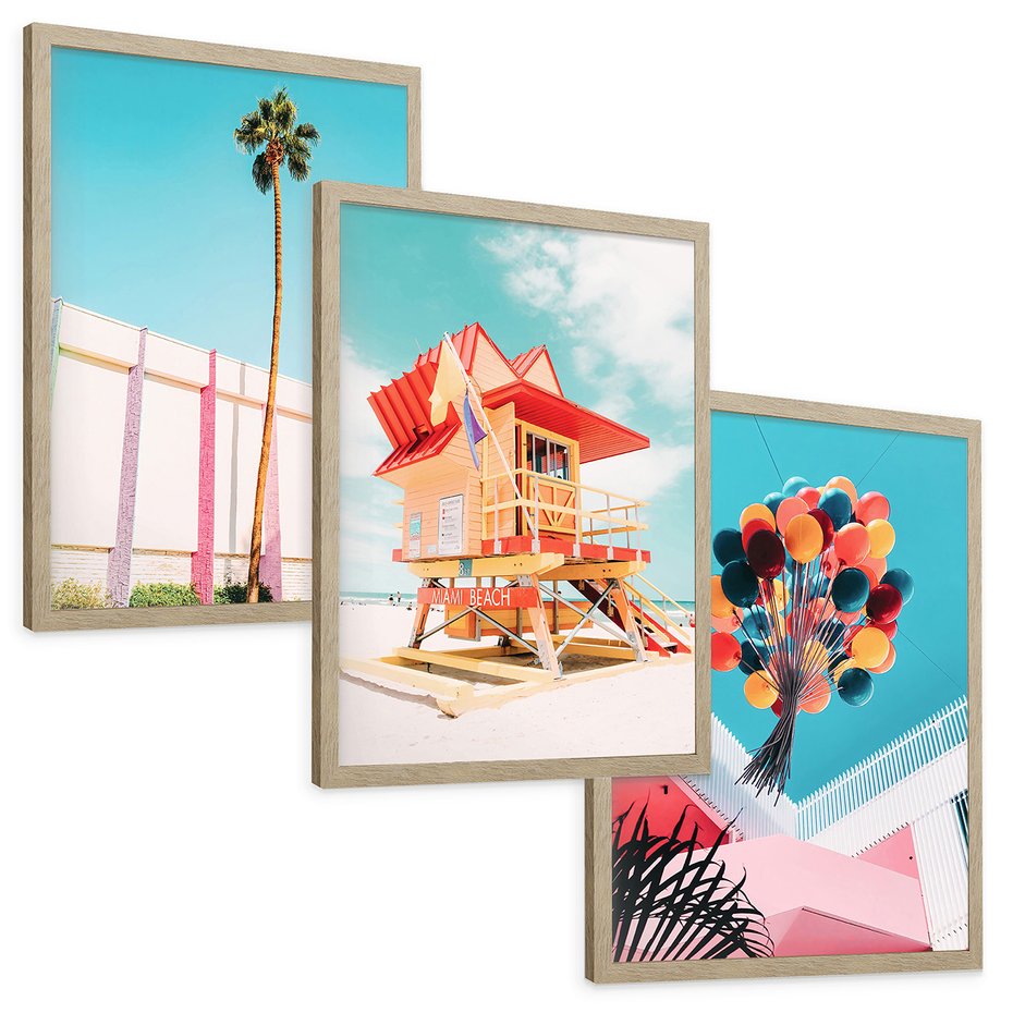 Zestaw obrazy w ramie, plakaty - plaża,palma,budynek - rama drewno