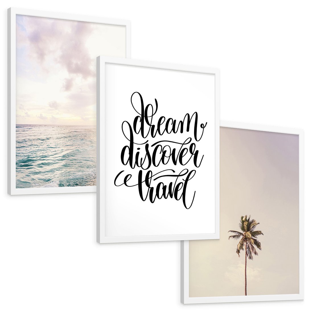 Zestaw obrazy w ramie, plakaty - plaża,palma,napis - rama biała