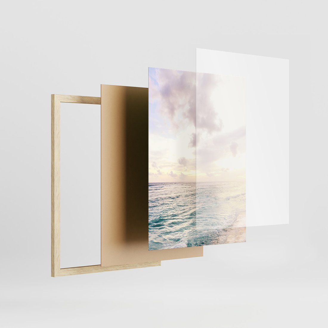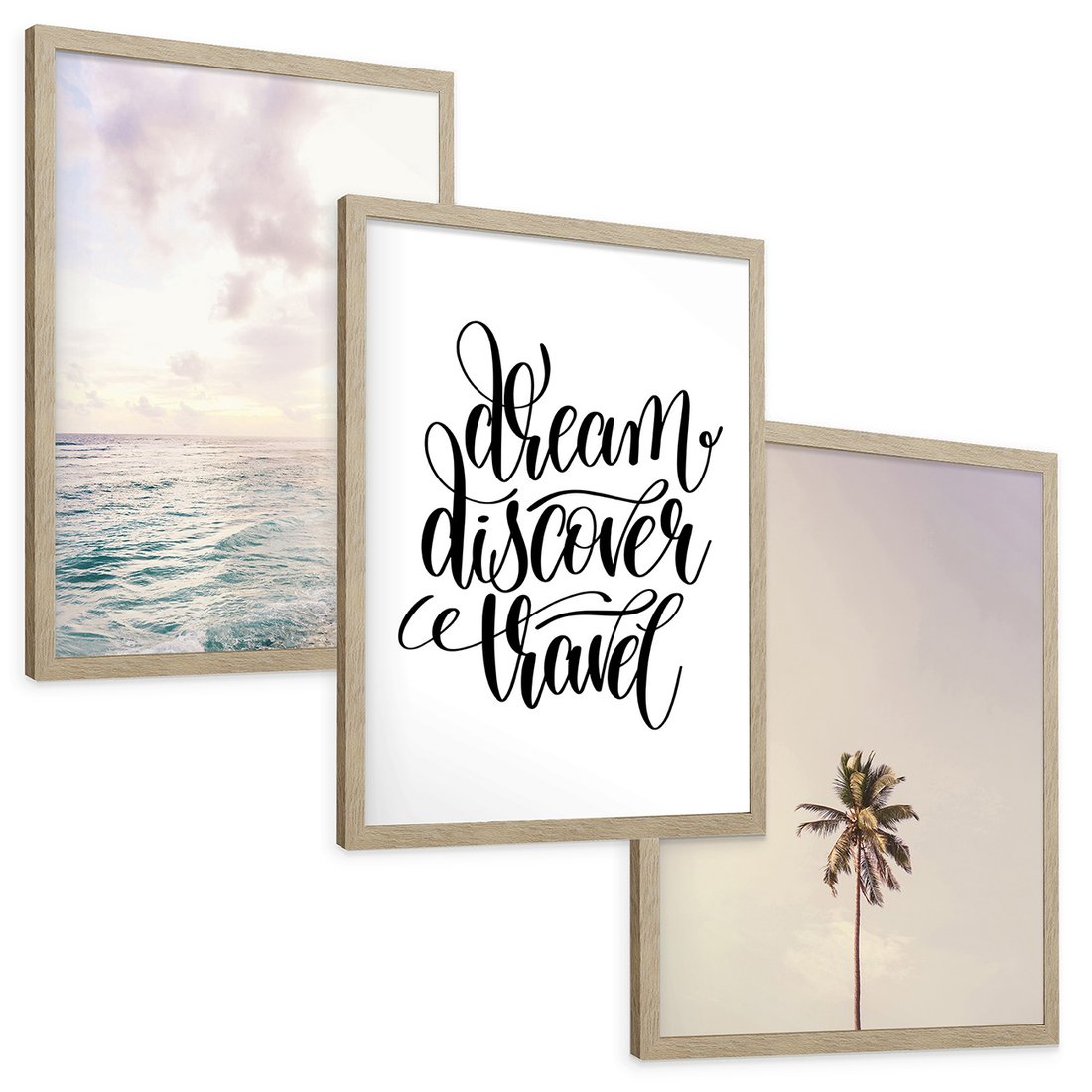 Zestaw obrazy w ramie, plakaty - plaża,palma,napis - rama drewno