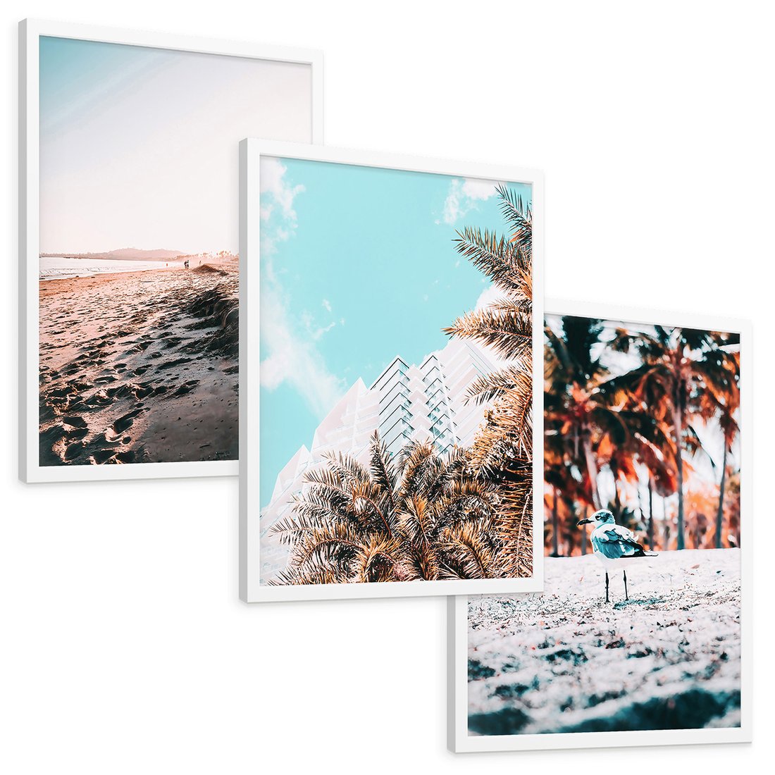 Zestaw obrazy w ramie, plakaty - plaża, palmy, budynek - rama biała