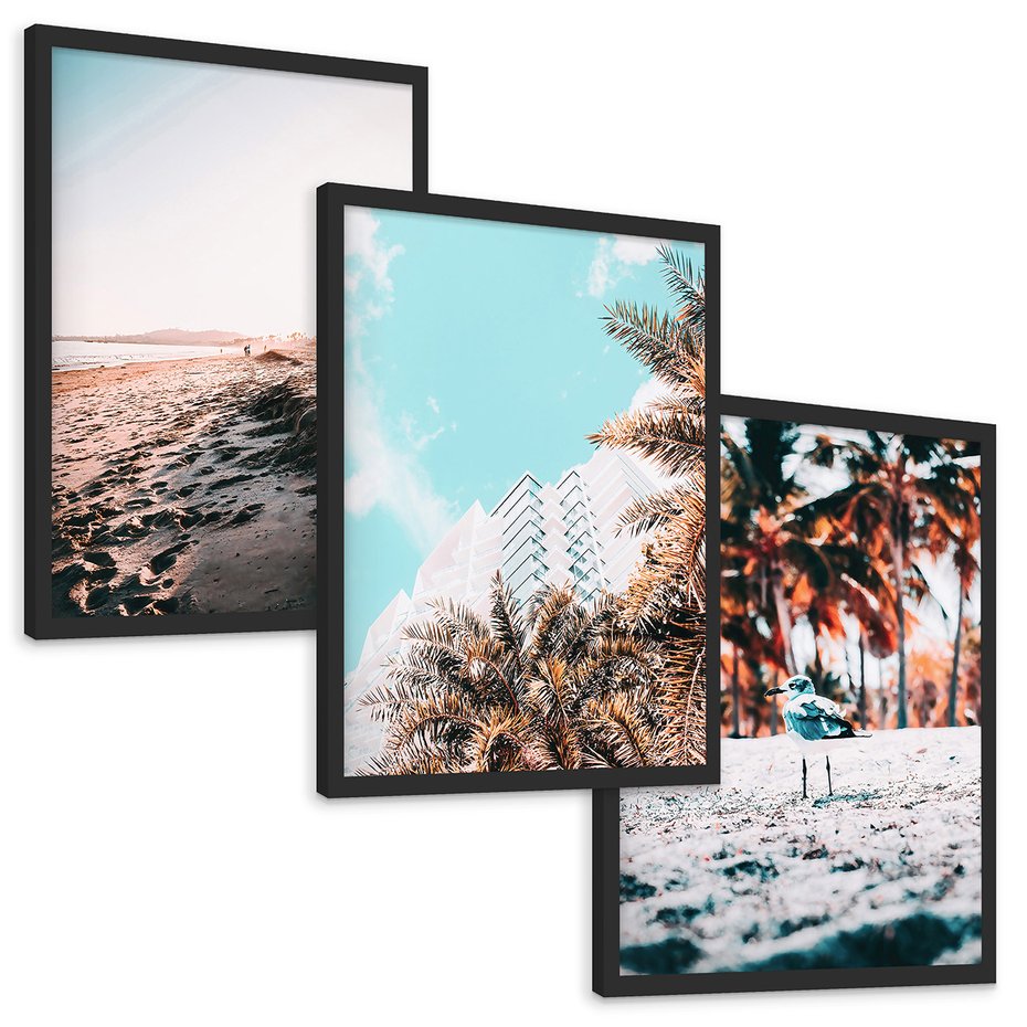 Zestaw obrazy w ramie, plakaty - plaża, palmy, budynek - rama czarna
