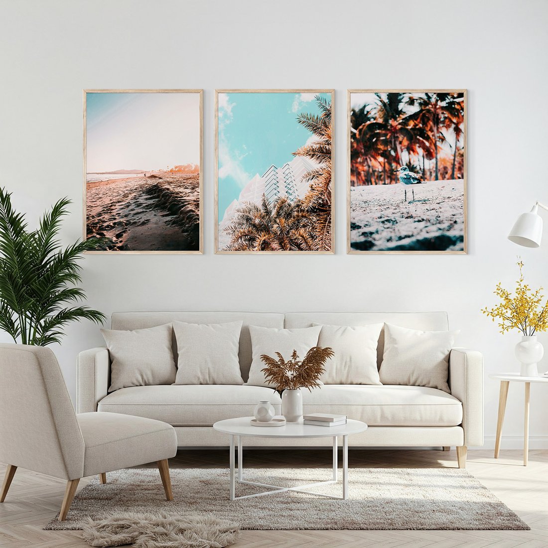 - Zestaw obrazy w ramie, plakaty - plaża, palmy, budynek