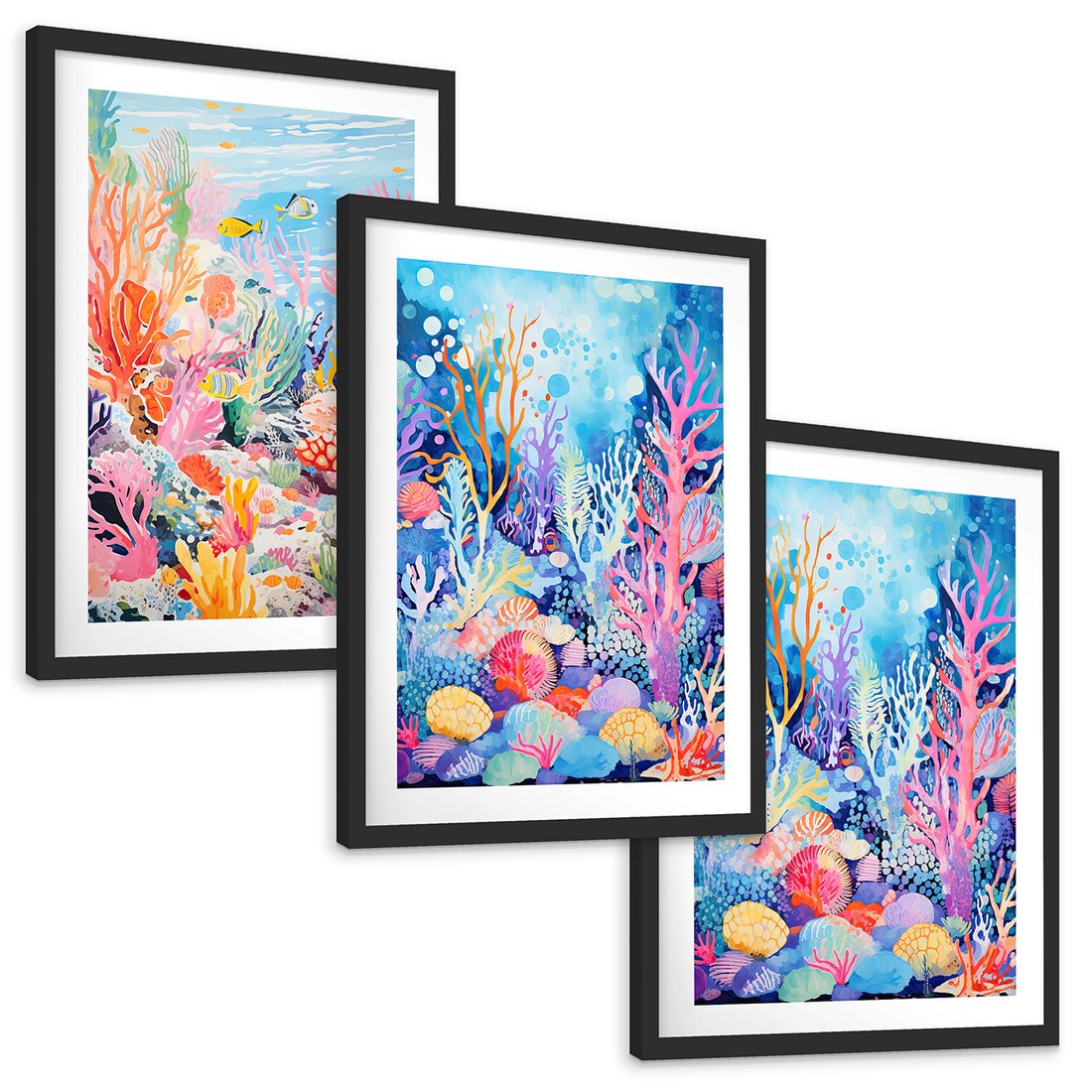 Zestaw obrazy w ramie, plakaty - podwodny, rafa, ryby - rama czarna