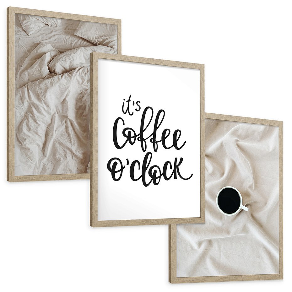 Zestaw obrazy w ramie, plakaty - pościel, kawa, relaks - rama drewno