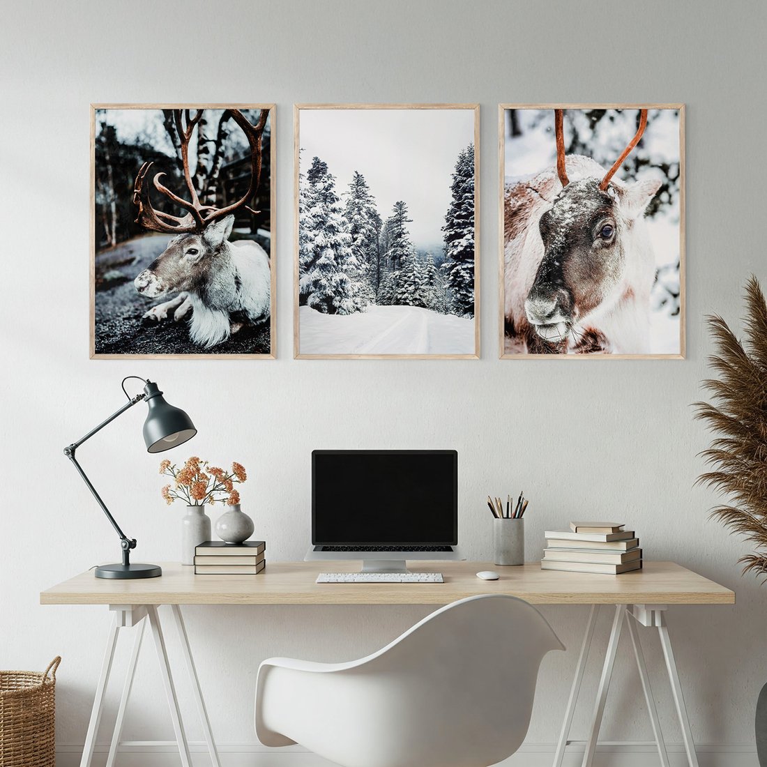 - Zestaw obrazy w ramie, plakaty - renifer, zima, śnieg