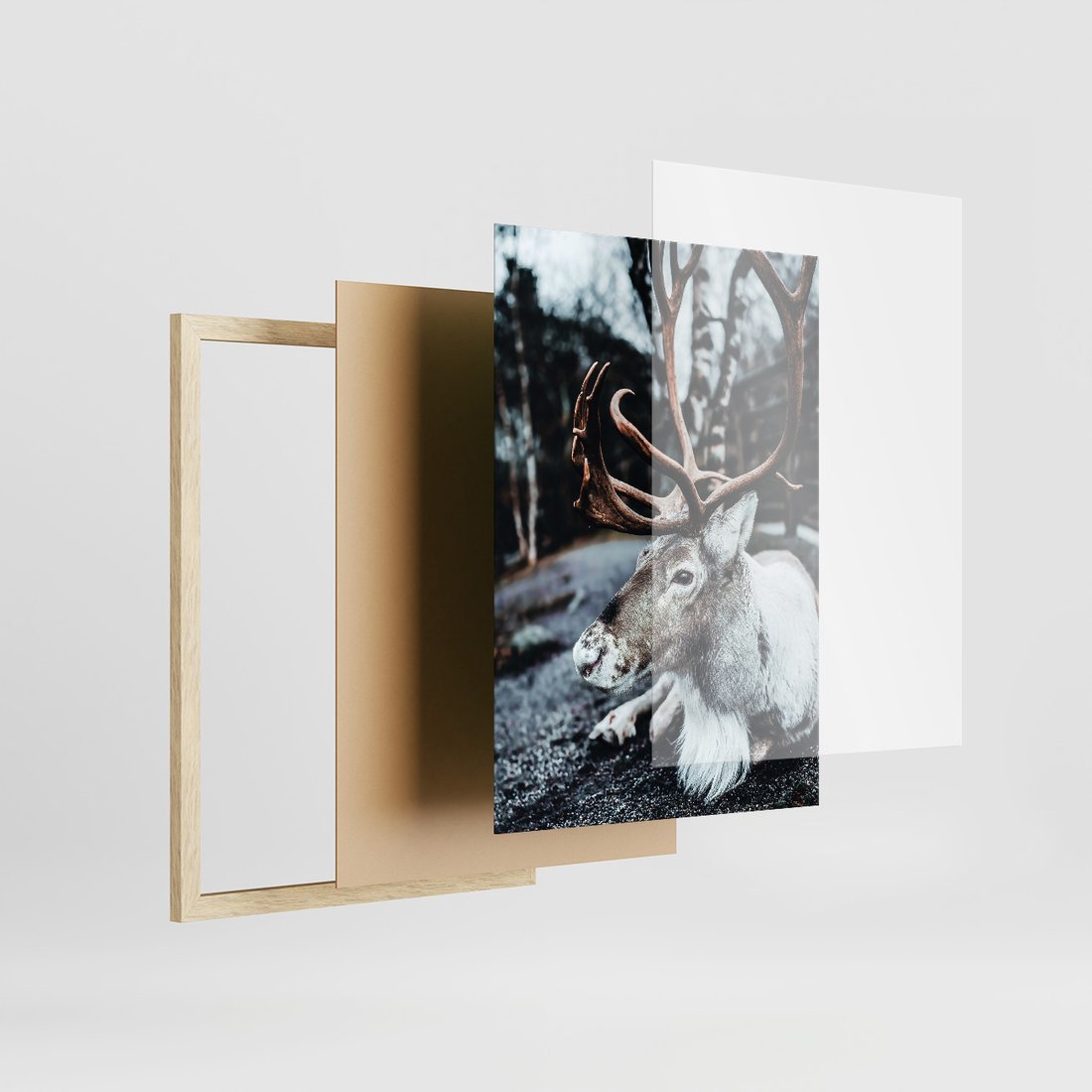 Zestaw obrazy w ramie, plakaty - renifer, zima, śnieg - rama drewno