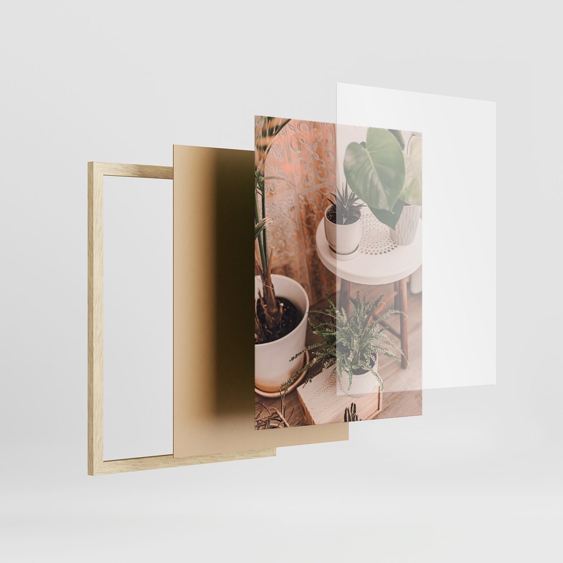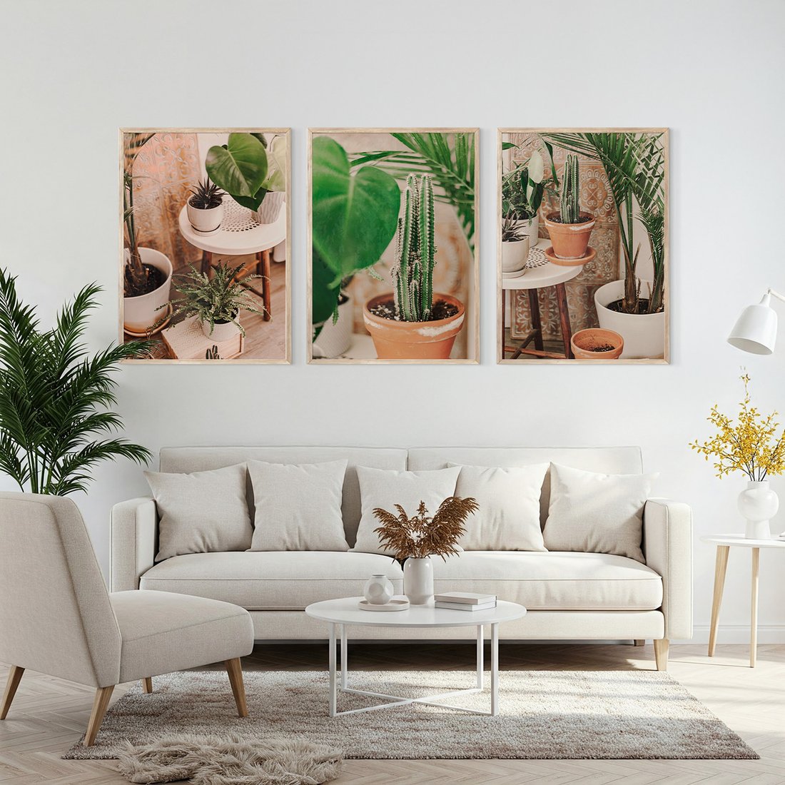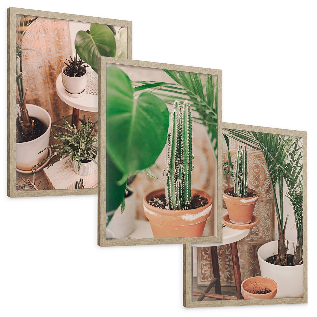Zestaw obrazy w ramie, plakaty - rośliny, doniczki, wnętrze - rama drewno