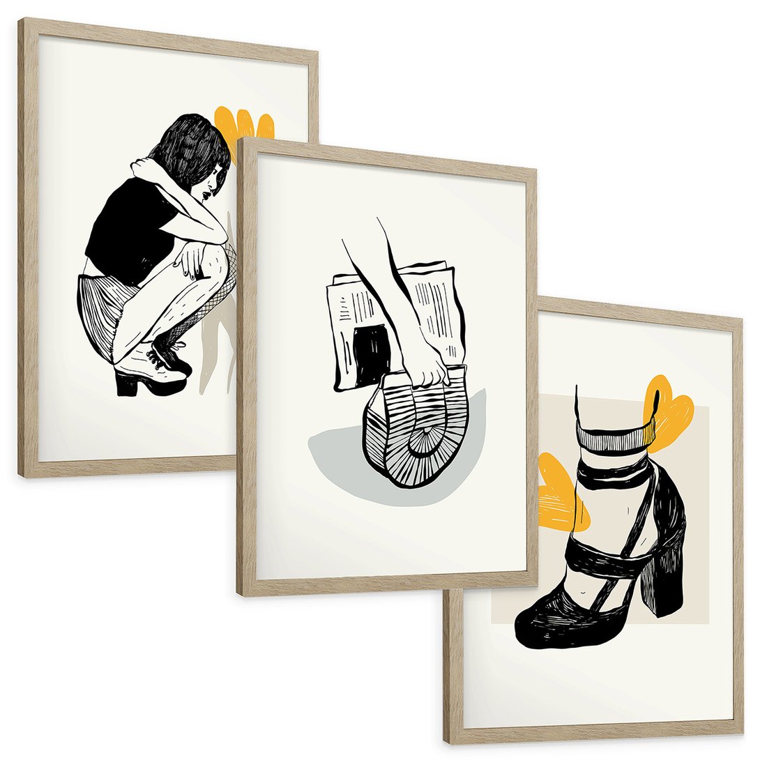 Zestaw obrazy w ramie, plakaty - rysunek, kobieta, kwiat - rama drewno