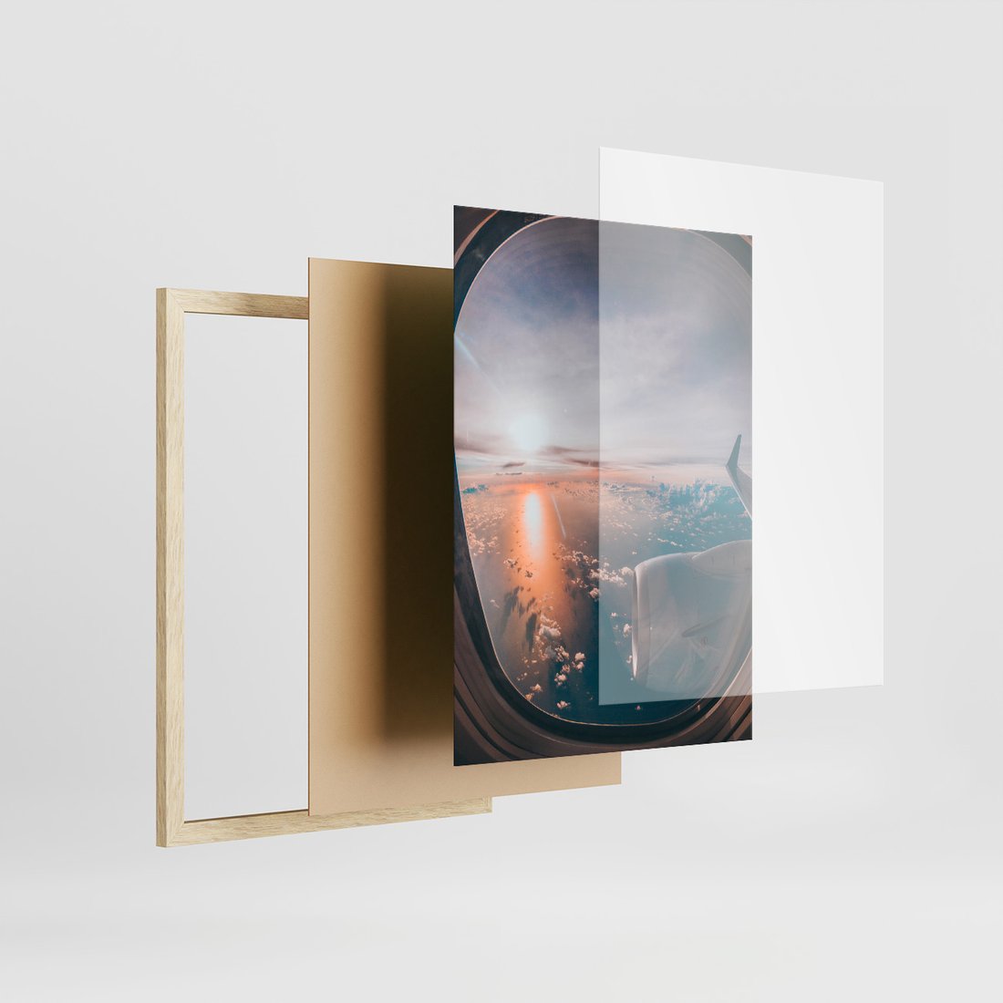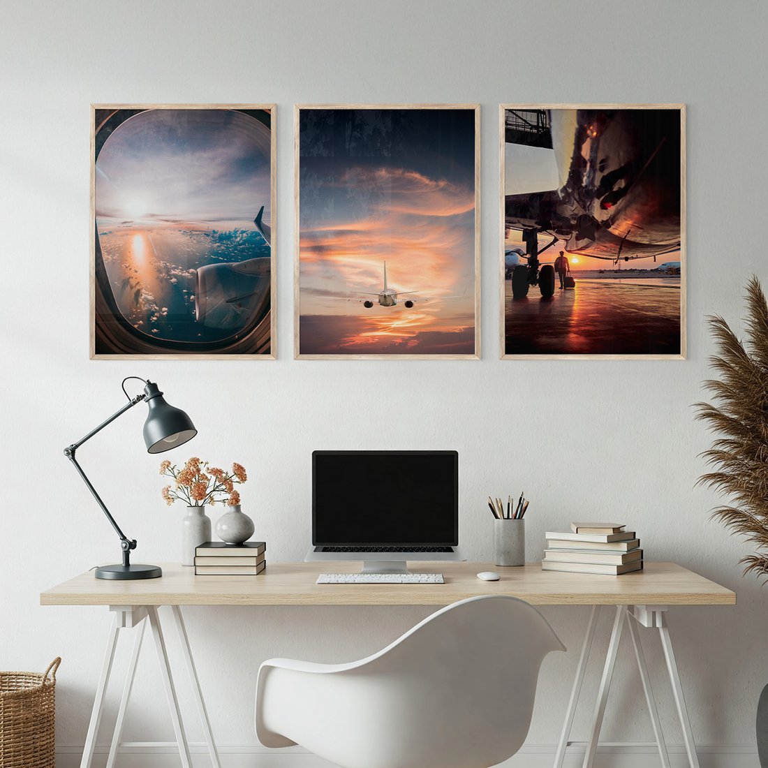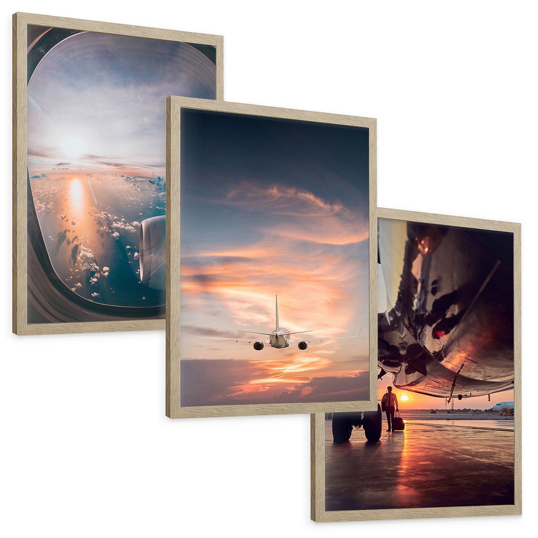 Zestaw obrazy w ramie, plakaty - samolot, niebo, podróż - rama drewno