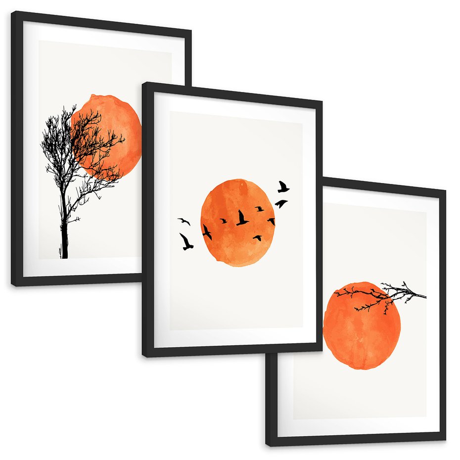Zestaw obrazy w ramie, plakaty - Słońce, Ptaki, Drzewa - rama czarna