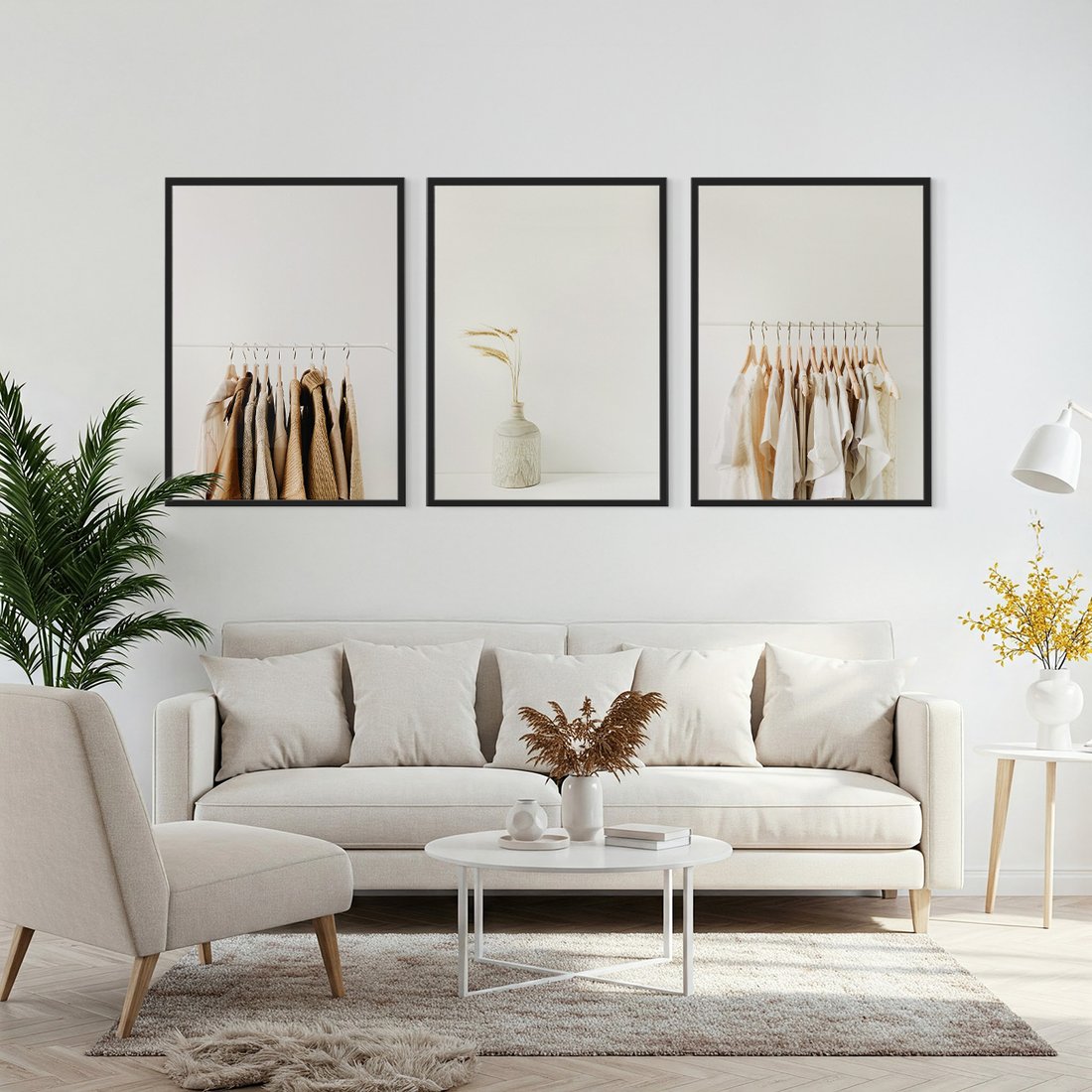 - Zestaw obrazy w ramie, plakaty - ubrania, wazon, beżowy