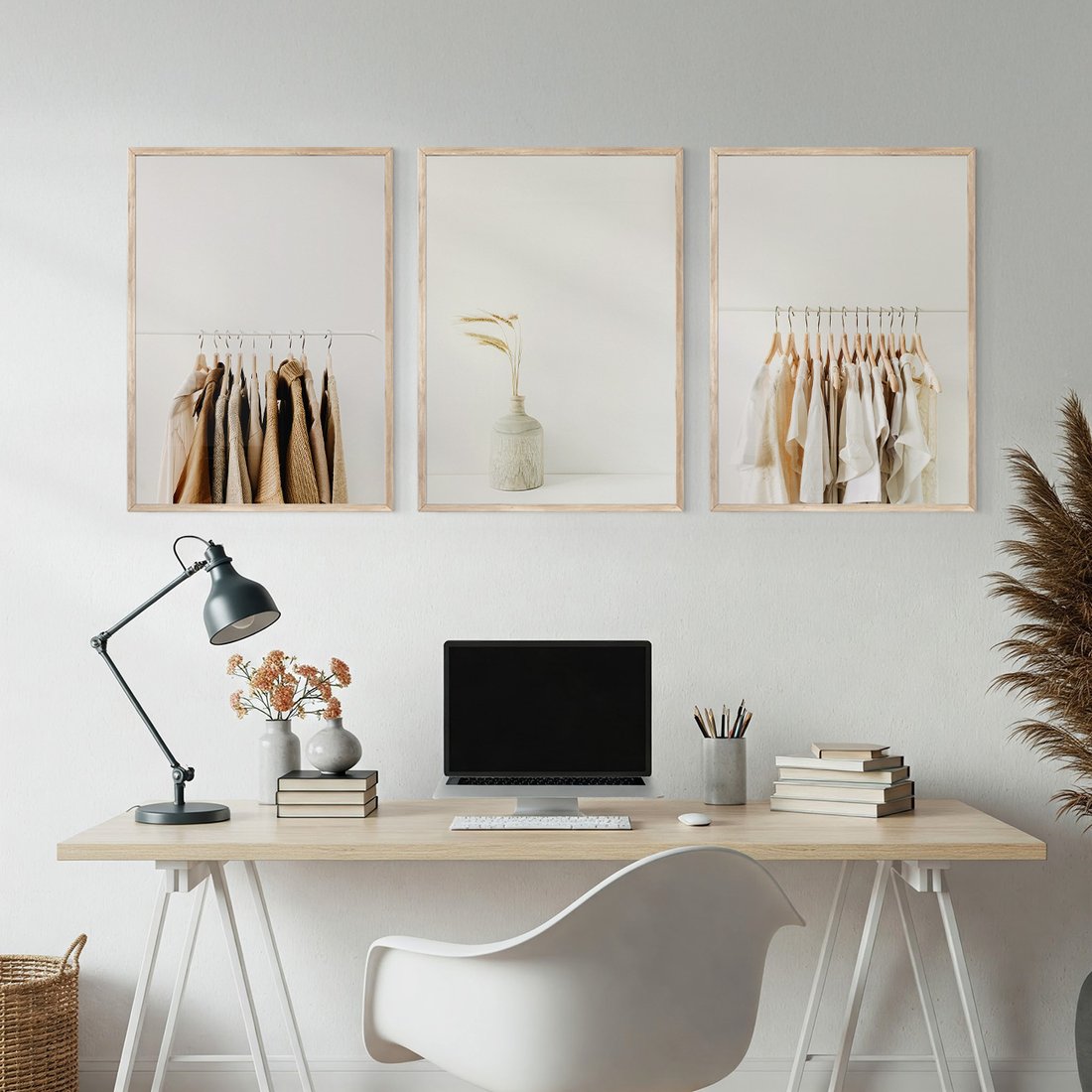 - Zestaw obrazy w ramie, plakaty - ubrania, wazon, beżowy