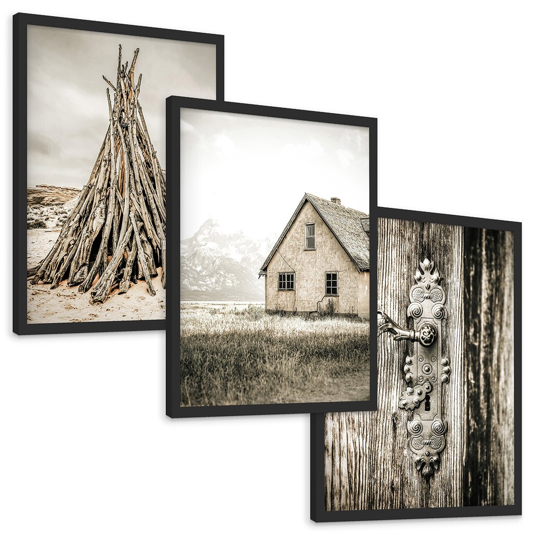 Zestaw obrazy w ramie, plakaty - vintage, dom, drewno - rama czarna
