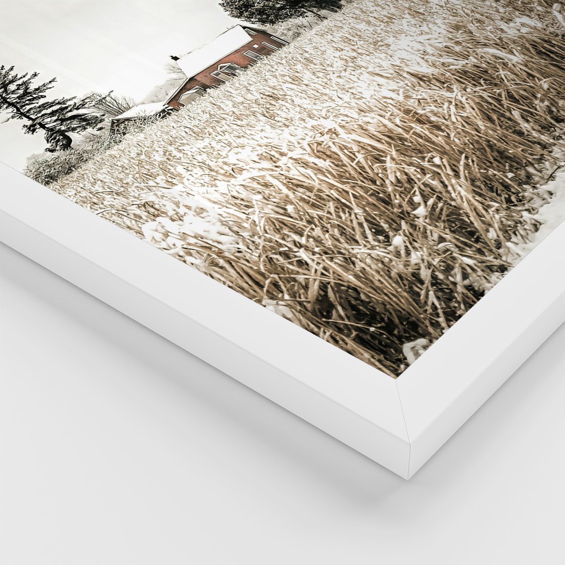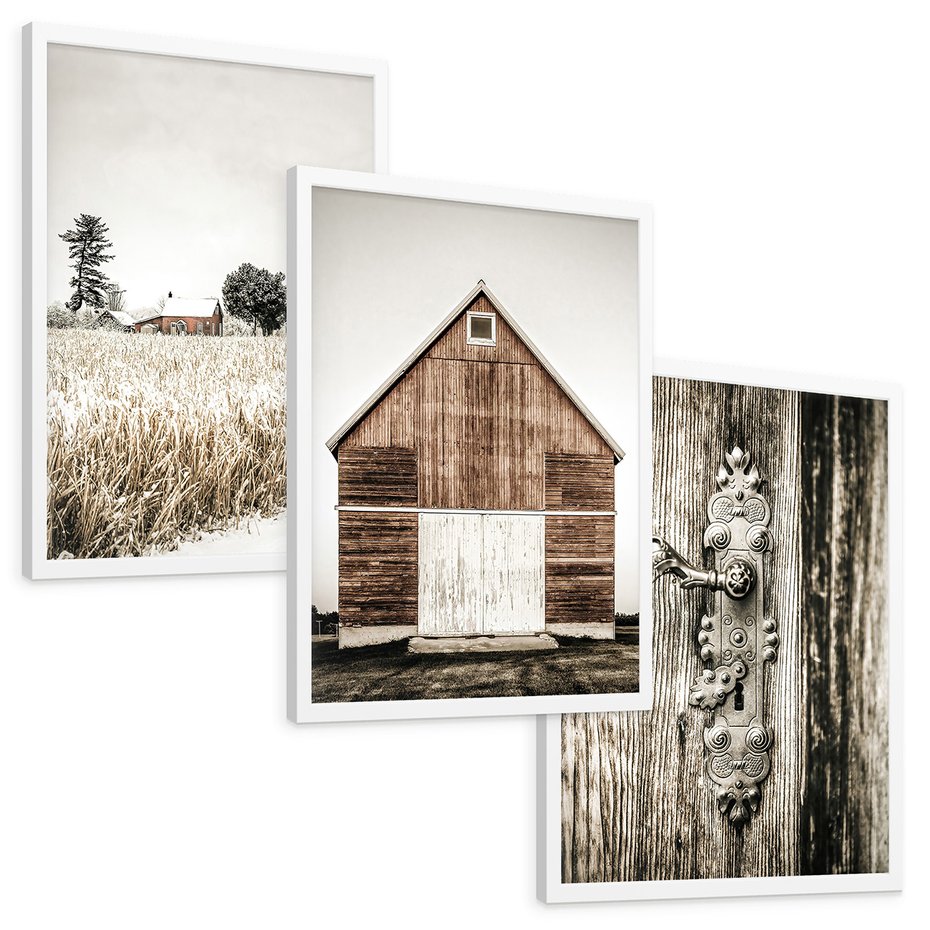 Zestaw obrazy w ramie, plakaty - wieś, dom, drewno - rama biała
