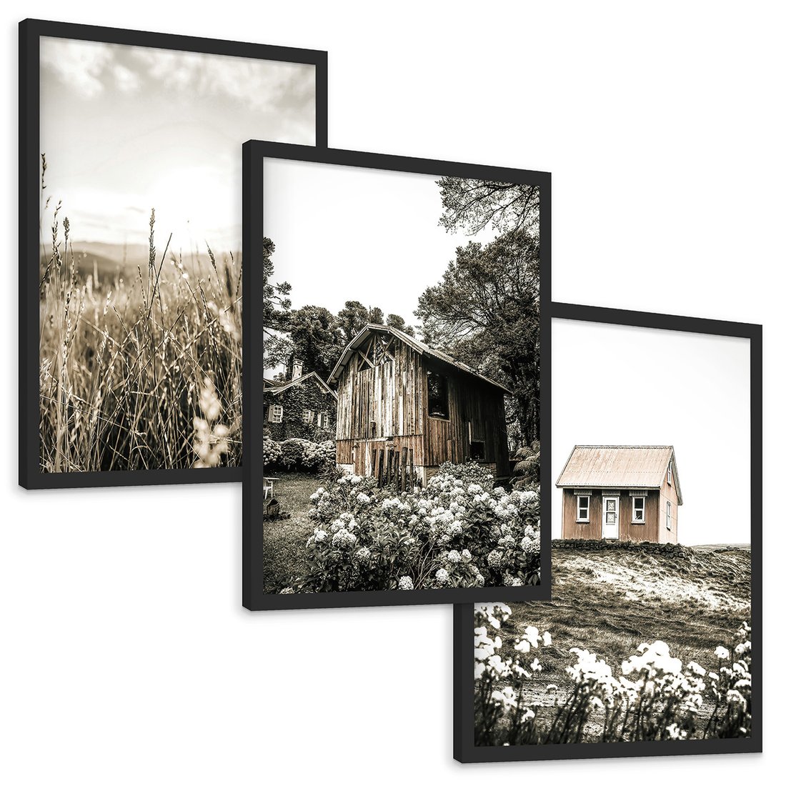Zestaw obrazy w ramie, plakaty - wieś, natura, budynki - rama czarna
