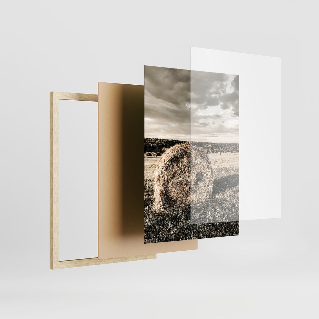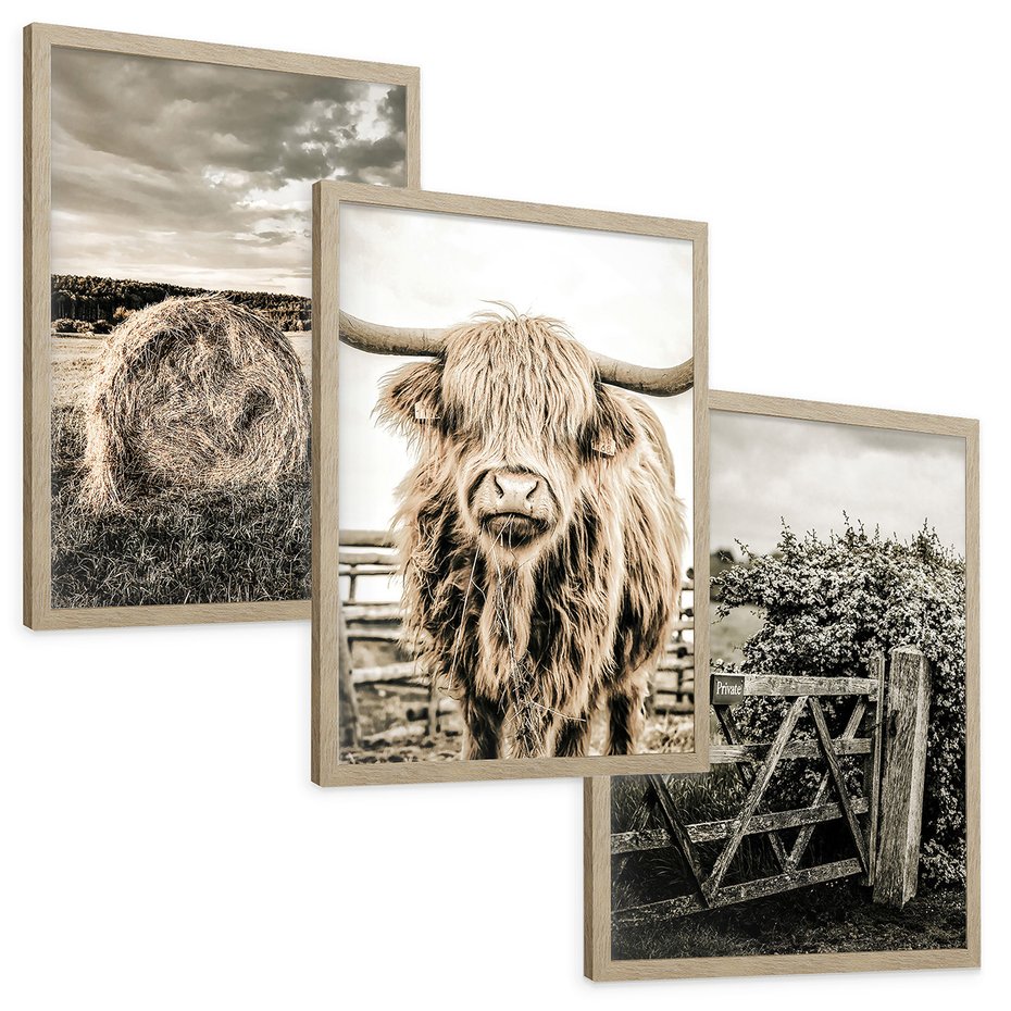 Zestaw obrazy w ramie, plakaty - wieś, zwierzęta, krajobraz - rama drewno
