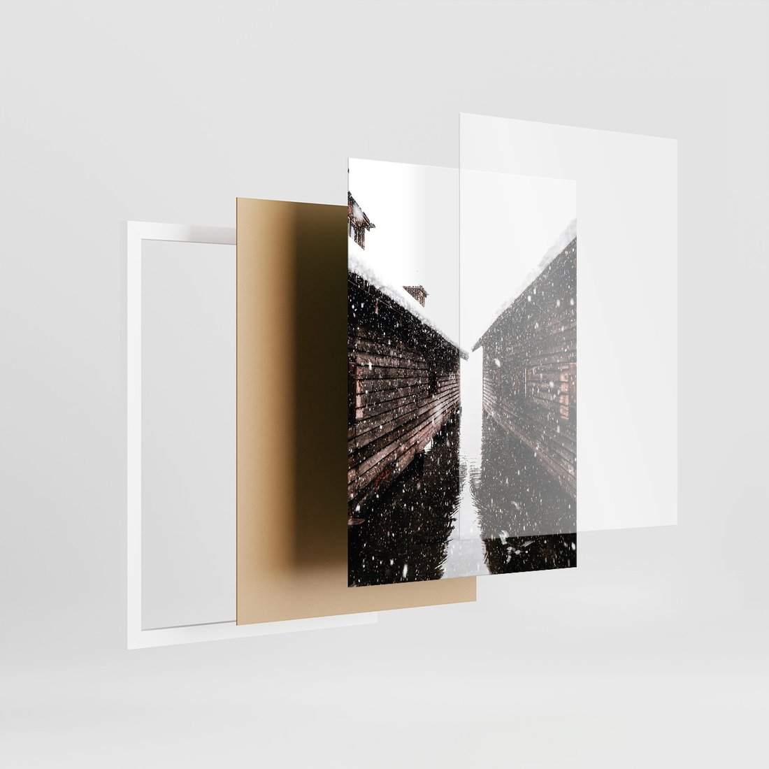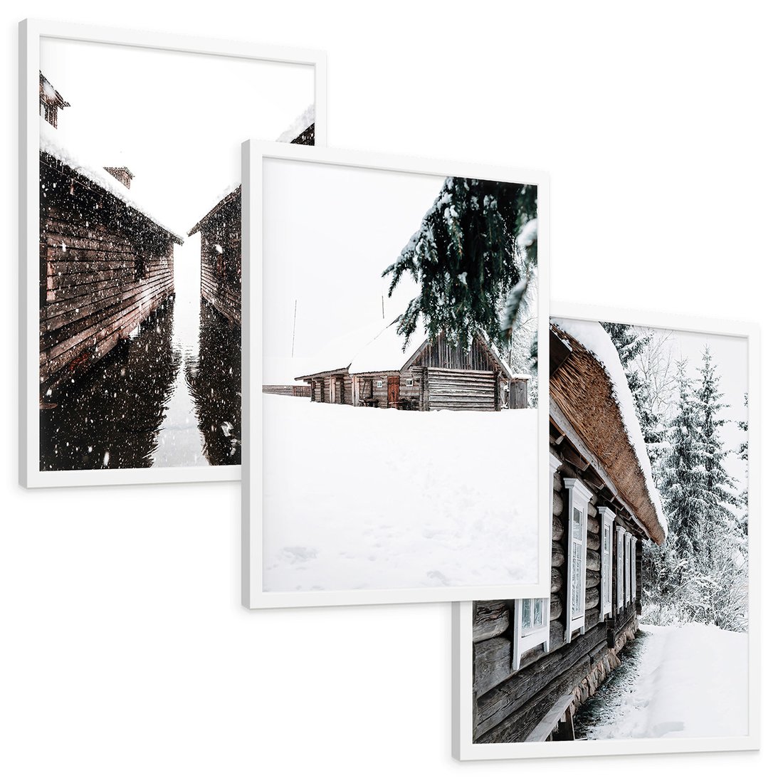 Zestaw obrazy w ramie, plakaty - zima, śnieg, budynki - rama biała