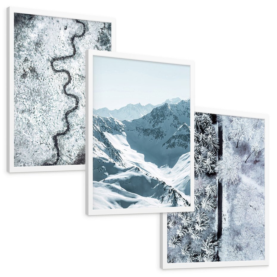 Zestaw obrazy w ramie, plakaty - zima, śnieg, góry - rama biała