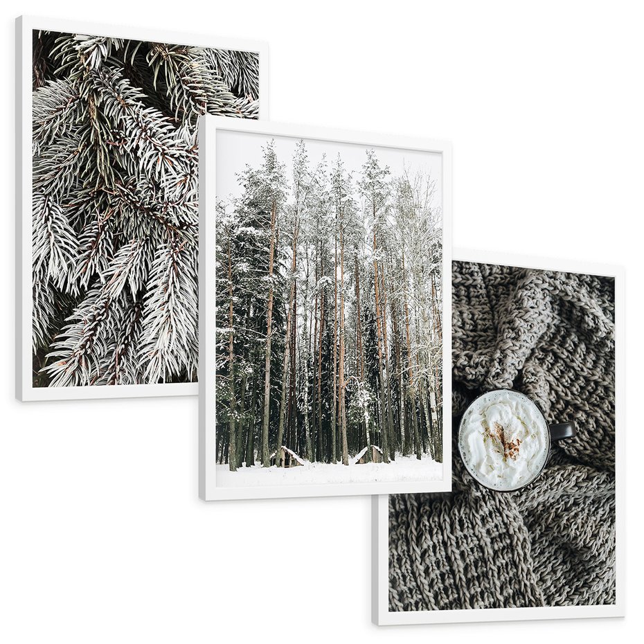 Zestaw obrazy w ramie, plakaty - zima, śnieg, las - rama biała