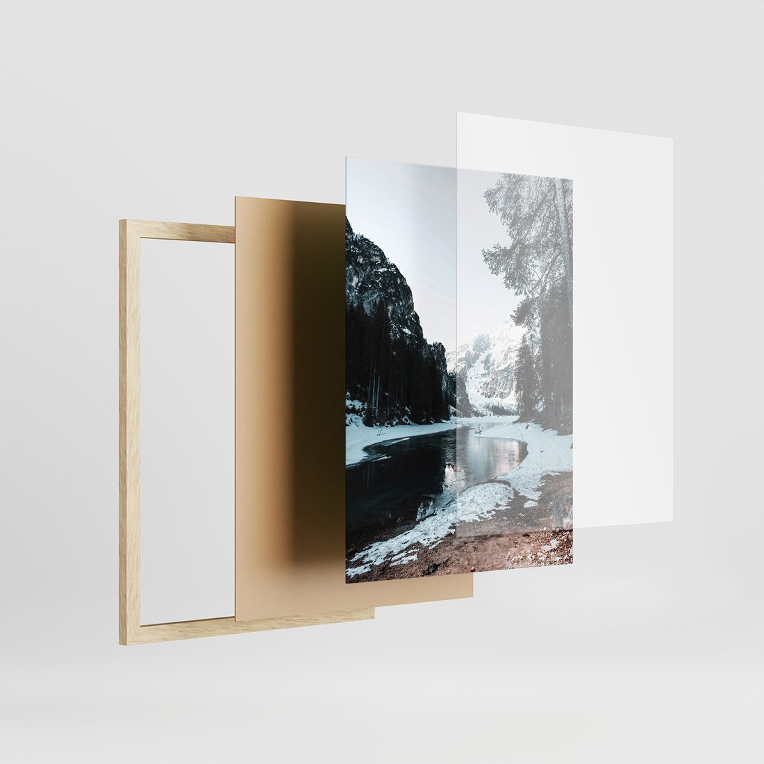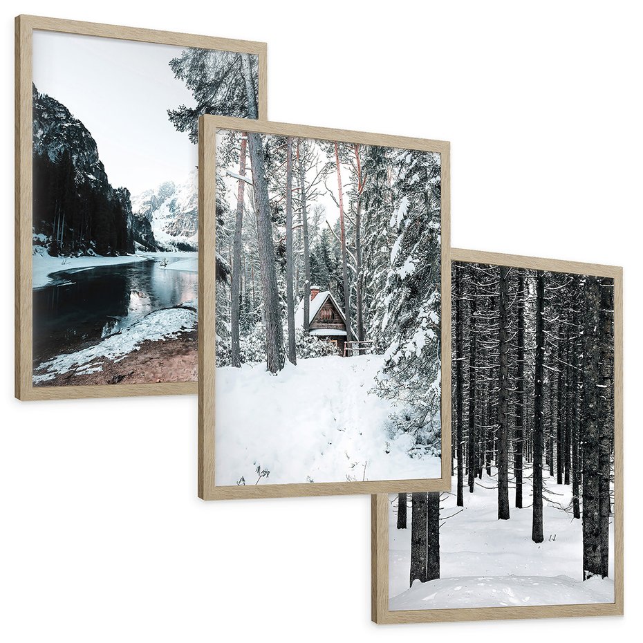 Zestaw obrazy w ramie, plakaty - zima, śnieg, las - rama drewno